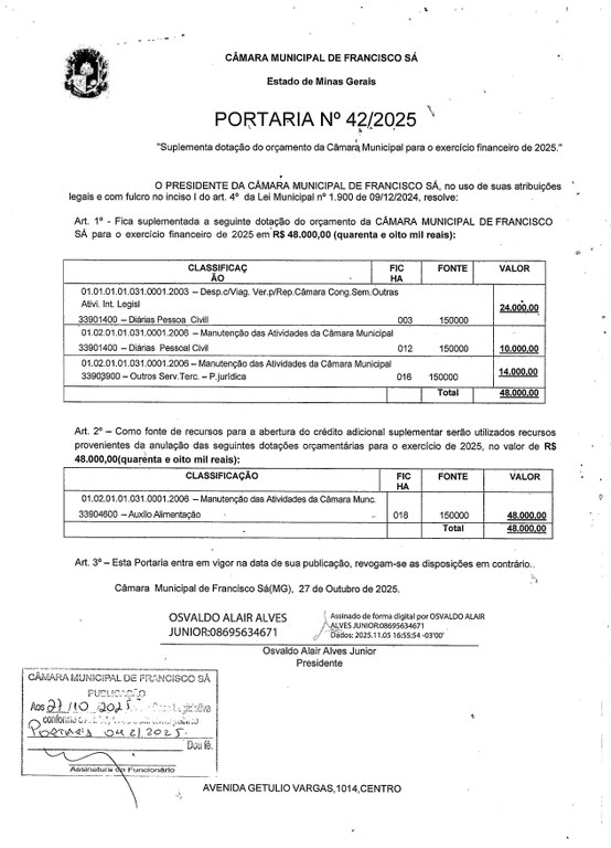 Local: Plenário da Câmara Municipal de Francisco Sá/MG Data: 13 de novembro de 2025 Horário: 13h30.