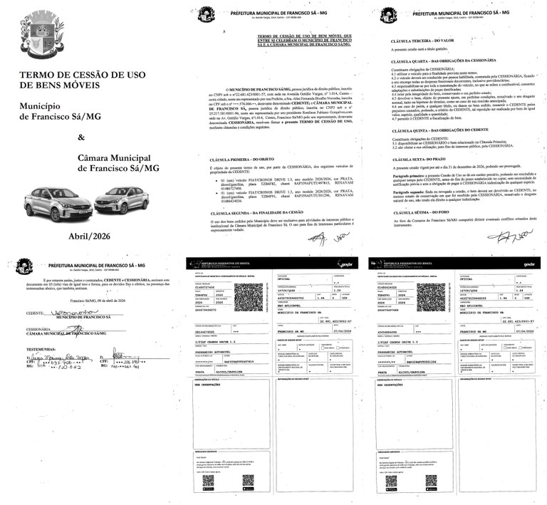 O MUNICÍPIO DE FRANCISCO SÁ/MG e a CÂMARA MUNICIPAL DE FRANCISCO SÁ resolvem firmar o presente TERMO DE CESSÃO DE USO de 2 (dois) veículos conforme descritos neste.