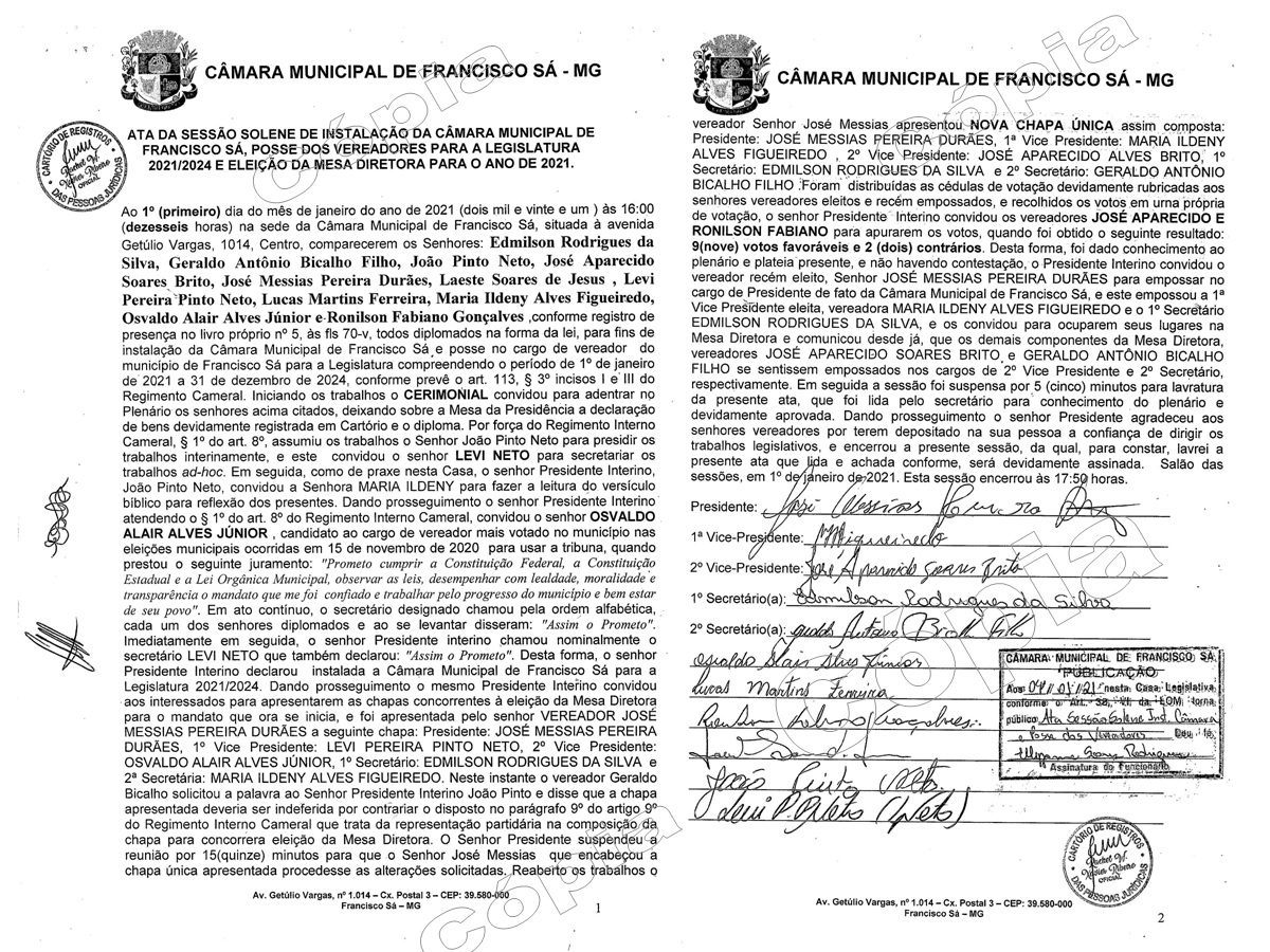 Cópia da Ata da Sessão Ordinária da Câmara Municipal de Francisco Sá: eleição da mesa diretora para o ano de 2021.