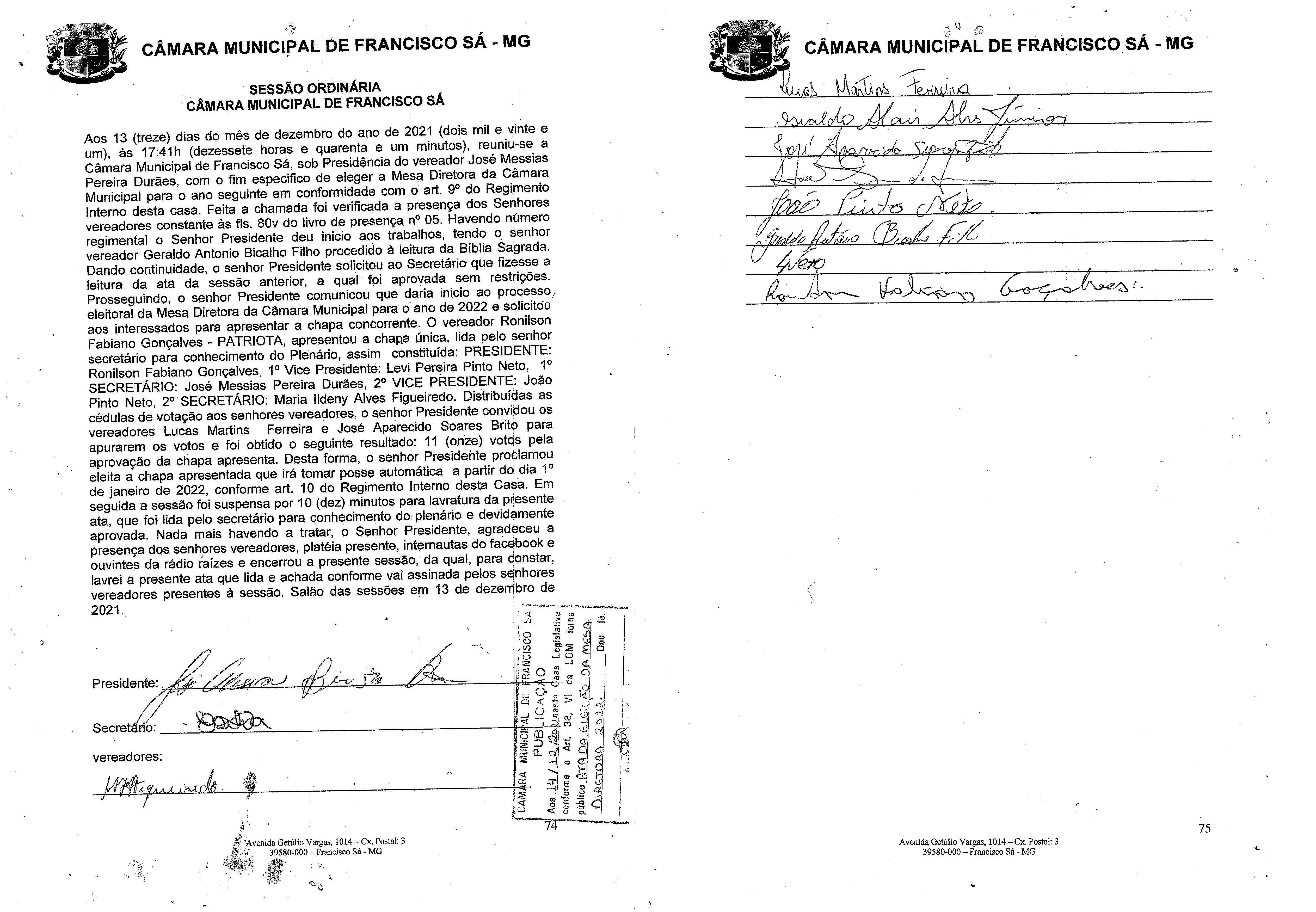 Cópia da Ata da Sessão Ordinária da Câmara Municipal de Francisco Sá: eleição da mesa diretora para o ano de 2022.
