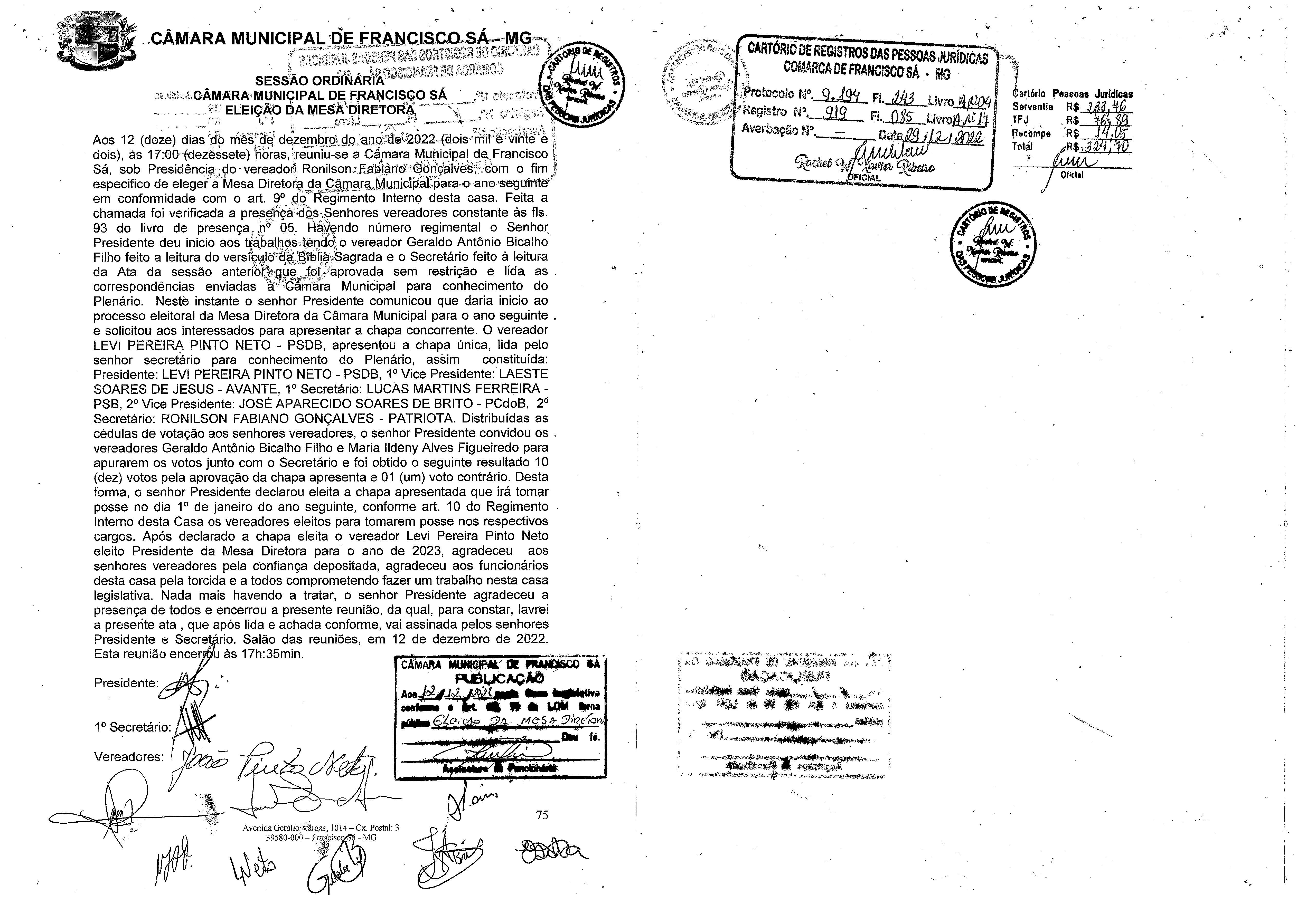 Cópia da Ata da Sessão Ordinária da Câmara Municipal de Francisco Sá: eleição da mesa diretora para o ano de 2023.