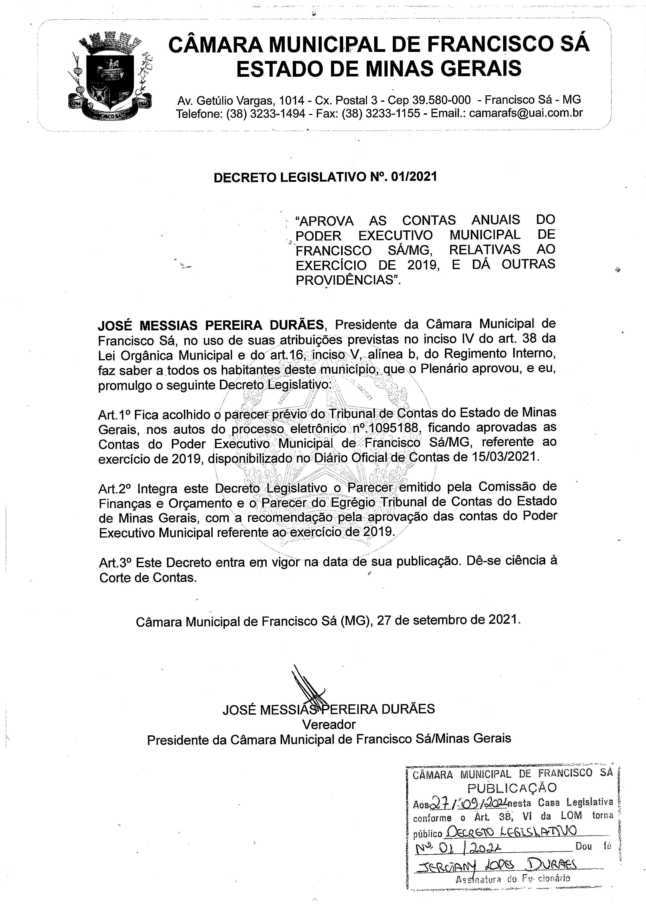 Aprova as contas anuais do Poder Executivo Municipal de Francisco Sá/MG, relativas ao exercício de 2019, e dá outras providências.