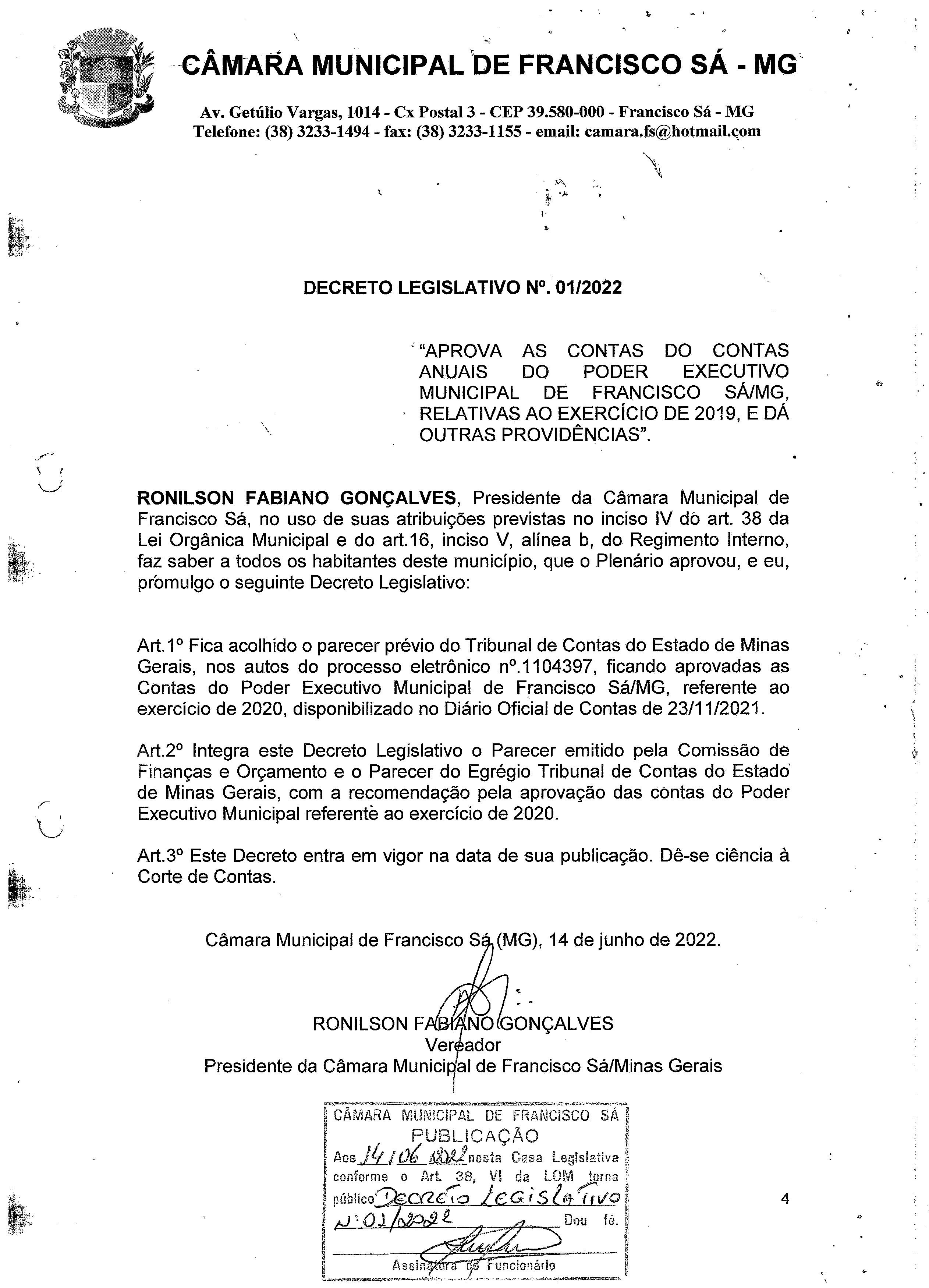 Aprova as contas anuais do Poder Executivo Municipal de Francisco Sá/MG, relativas ao exercício de 2020, e dá outras providências.
