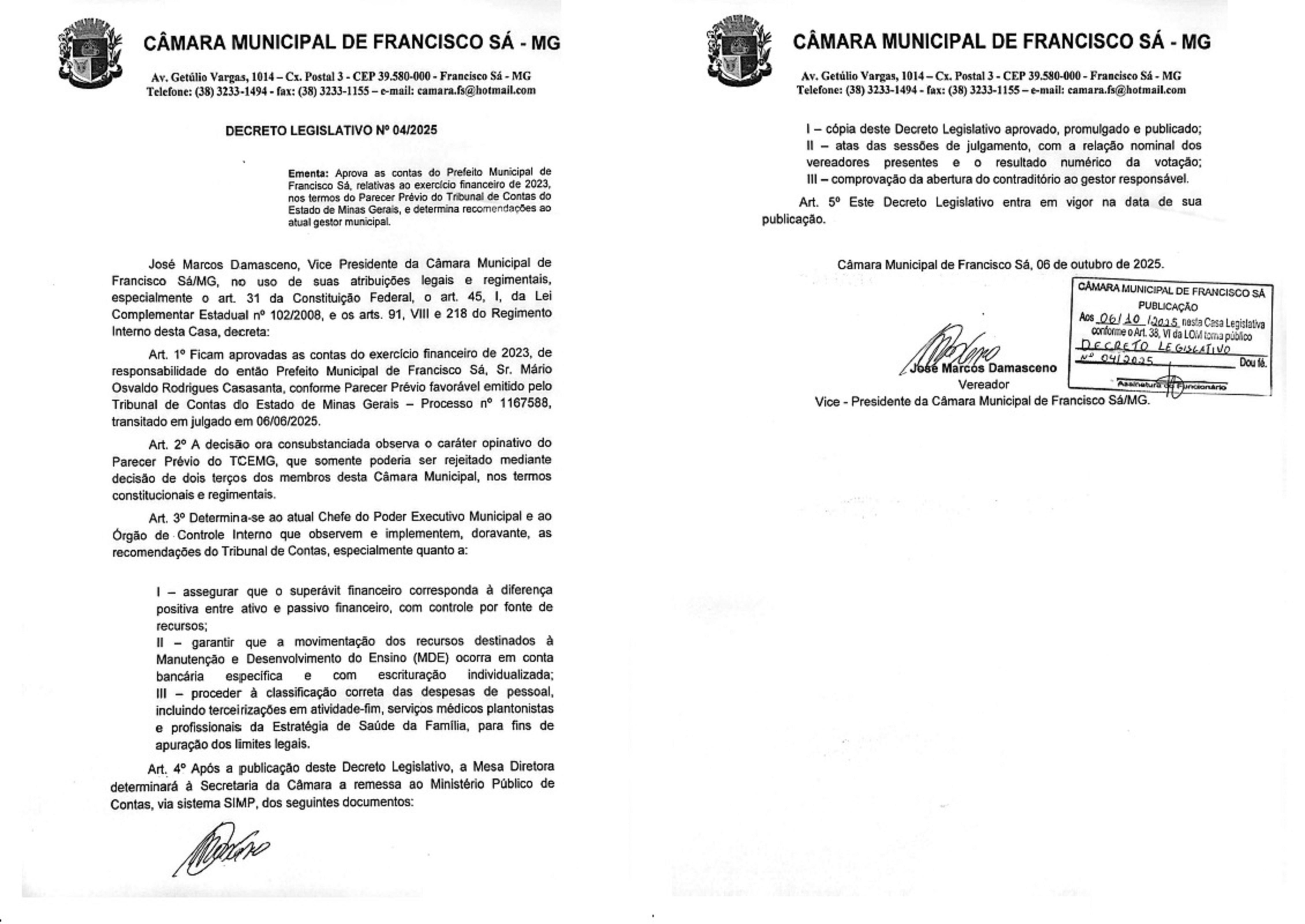 Aprova as contas anuais do Poder Executivo Municipal de Francisco Sá/MG, relativas ao exercício de 2023, e dá outras providências.