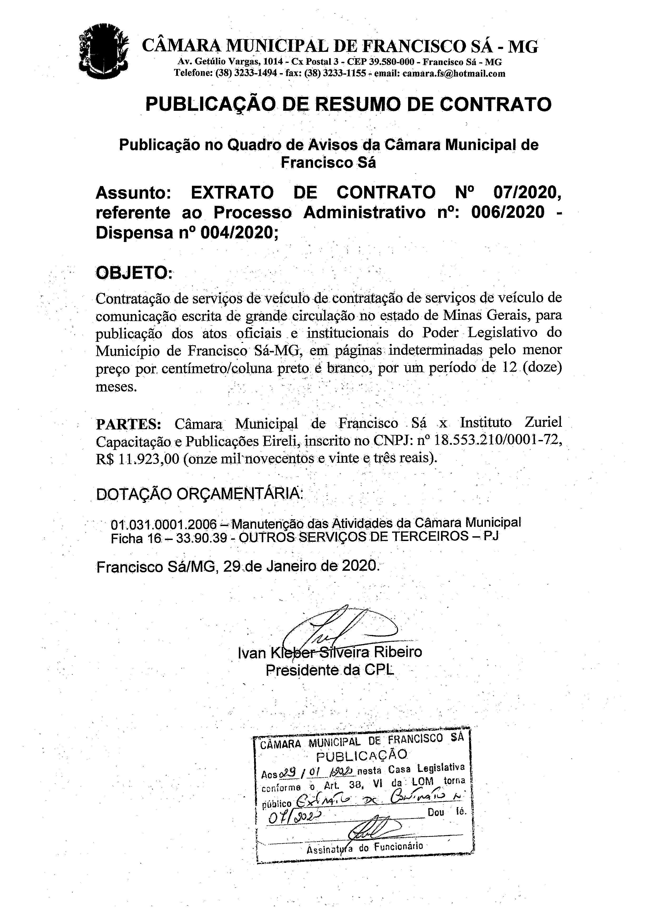 Extrato de Publicação do Contrato N.º 007/2020 - Processo Licitatório N.º 006/2020 - Dispensa N.º 004/2020 - Contratado: Instituto Zuriel Capacitação e Publicação Eireli.