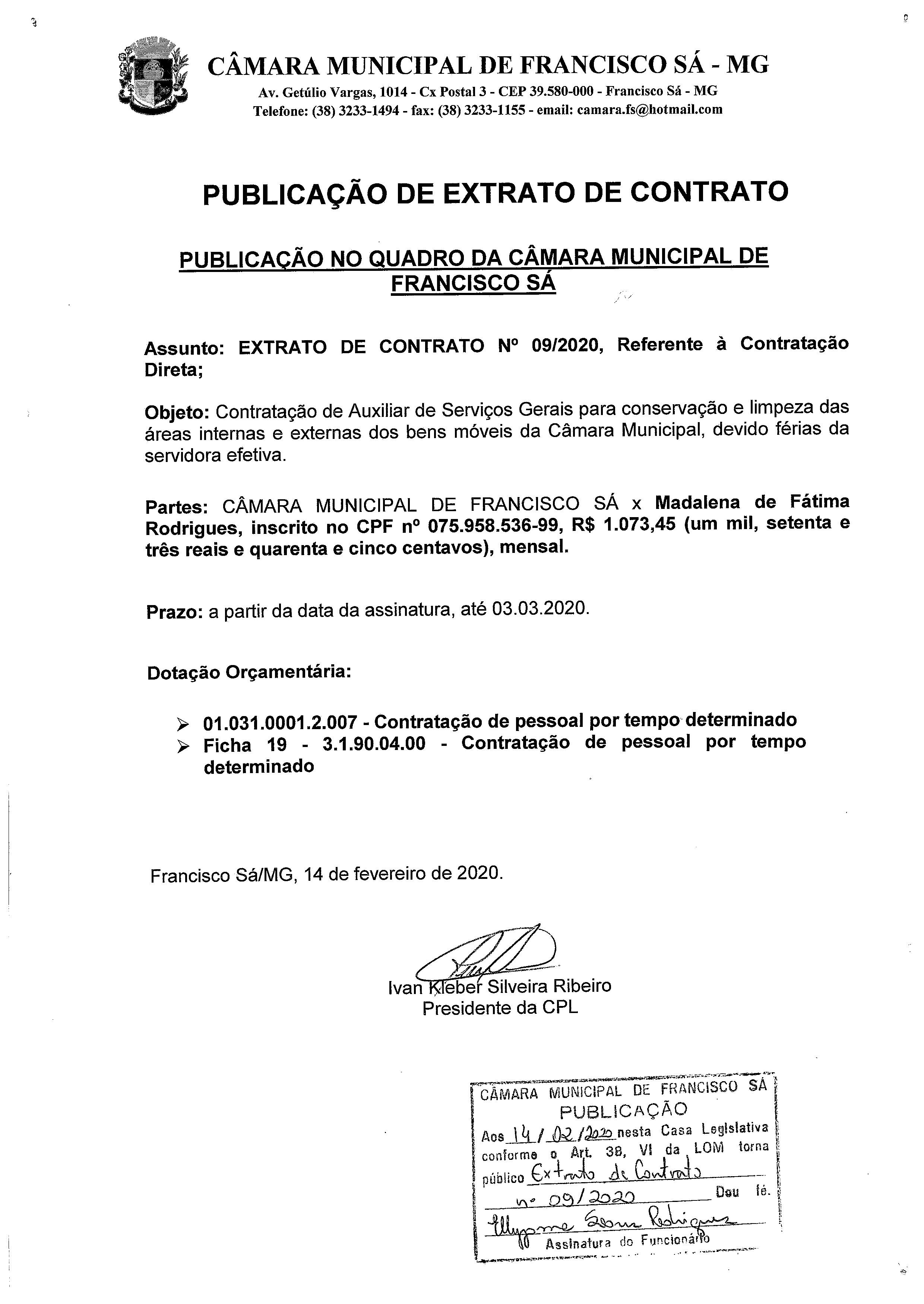 Extrato de Publicação do Contrato N.º 009/2020 - Contratação: Direta - Cargo: Auxiliar de Serviços Gerais.