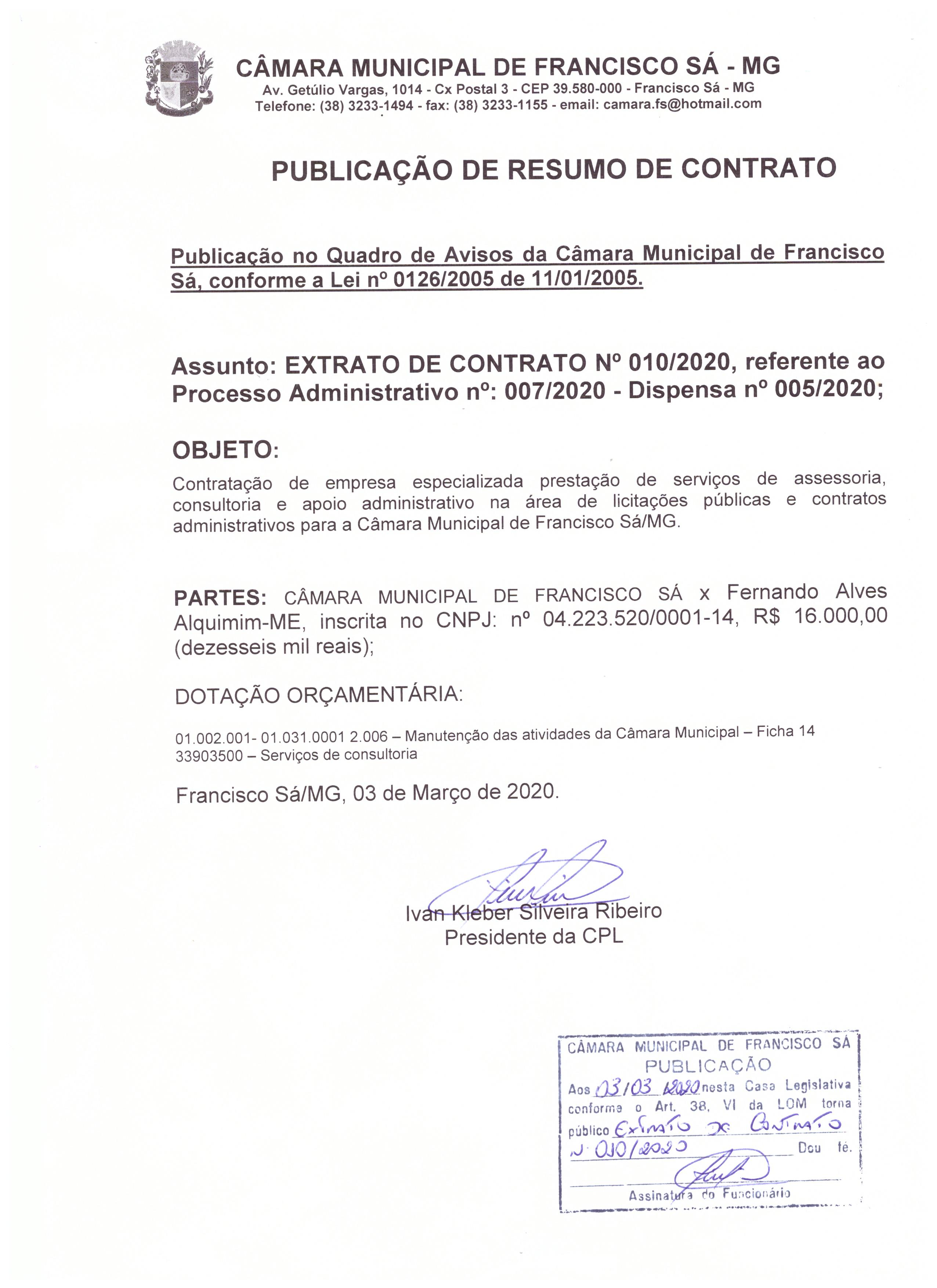 Extrato CTR N.º 010/2020 (PL 007/2020 Disp. 005/2020 - Assessoria Licitações)