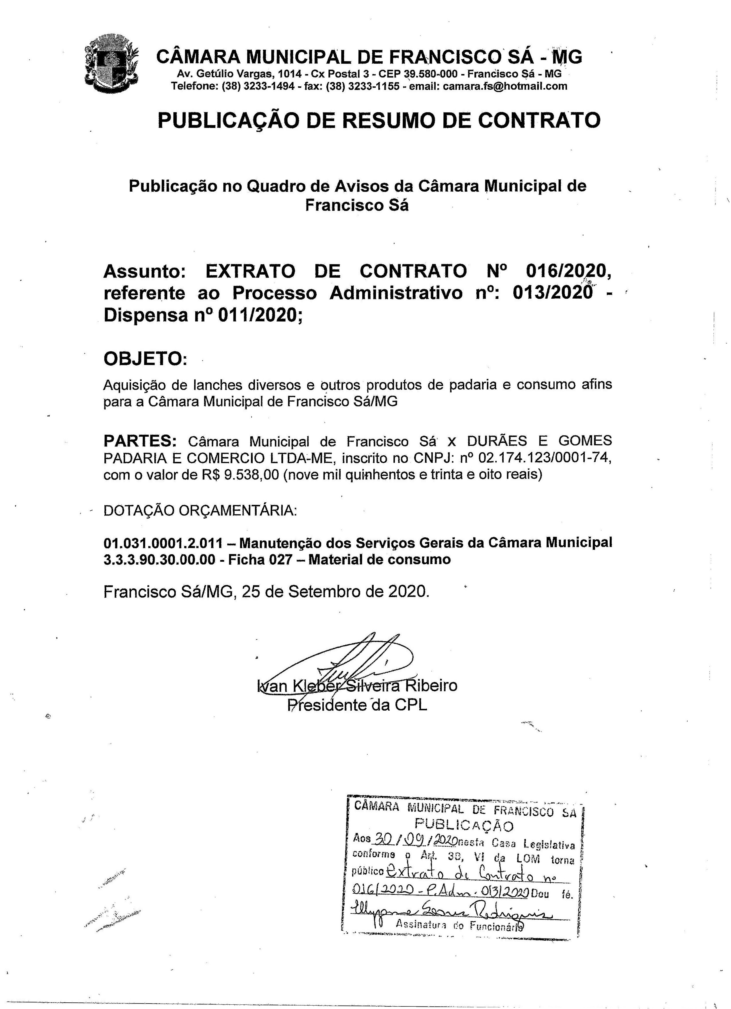 Extrato CTR N.º 016/2020 (PL 013/2020 Disp. 011/2020 - Aquisição de Lanches)