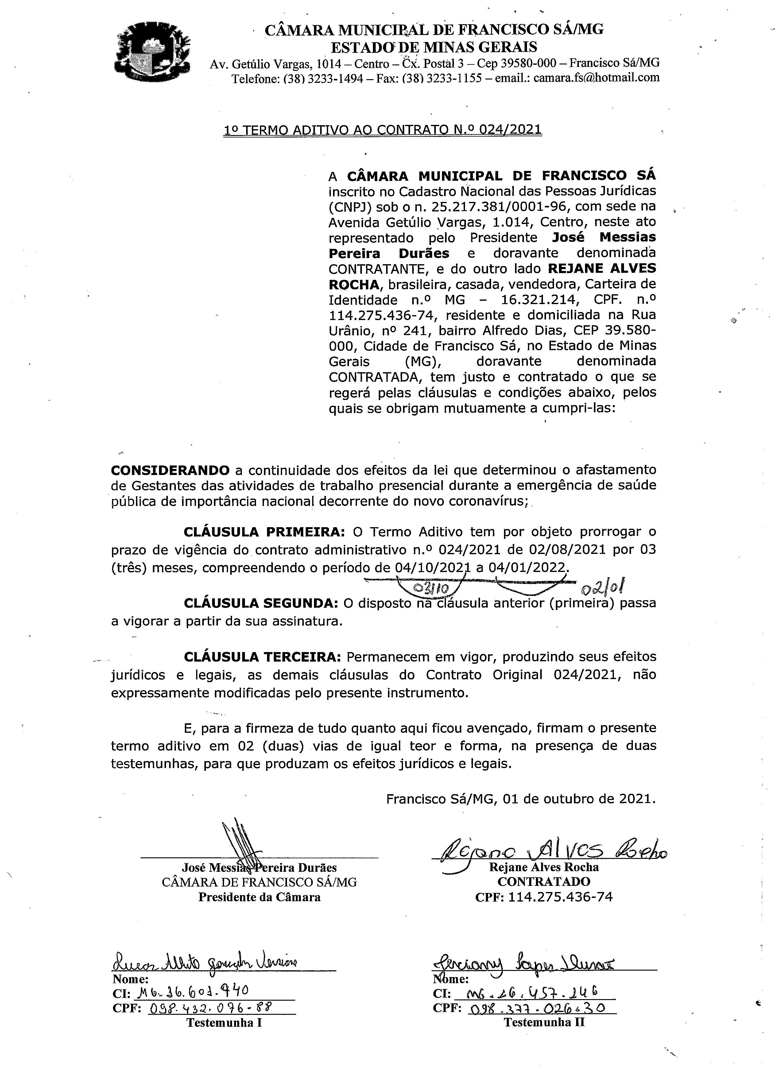 Publicação de Cópia do 1º Termo Aditivo ao Contrato N.º 024/2021 - Contratação: Direta - Cargo: Telefonista/Recepcionista - Contratada: Rejane Alves Rocha.