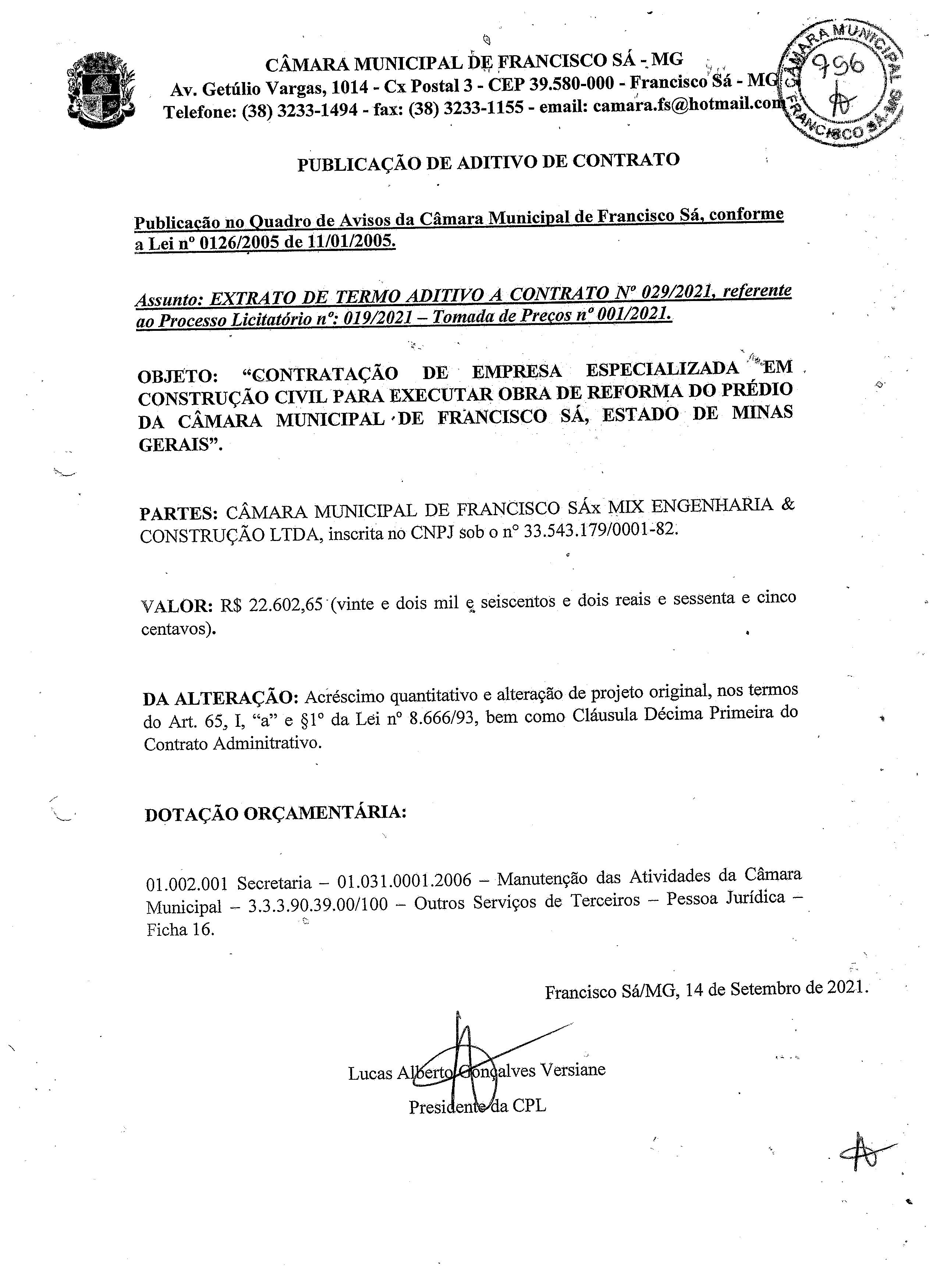 Extrato ADT N.º 001 CTR Nº 029/2021 (PL 019/2021 TP. 001/2021 - Obra de Reforma da Câmara)