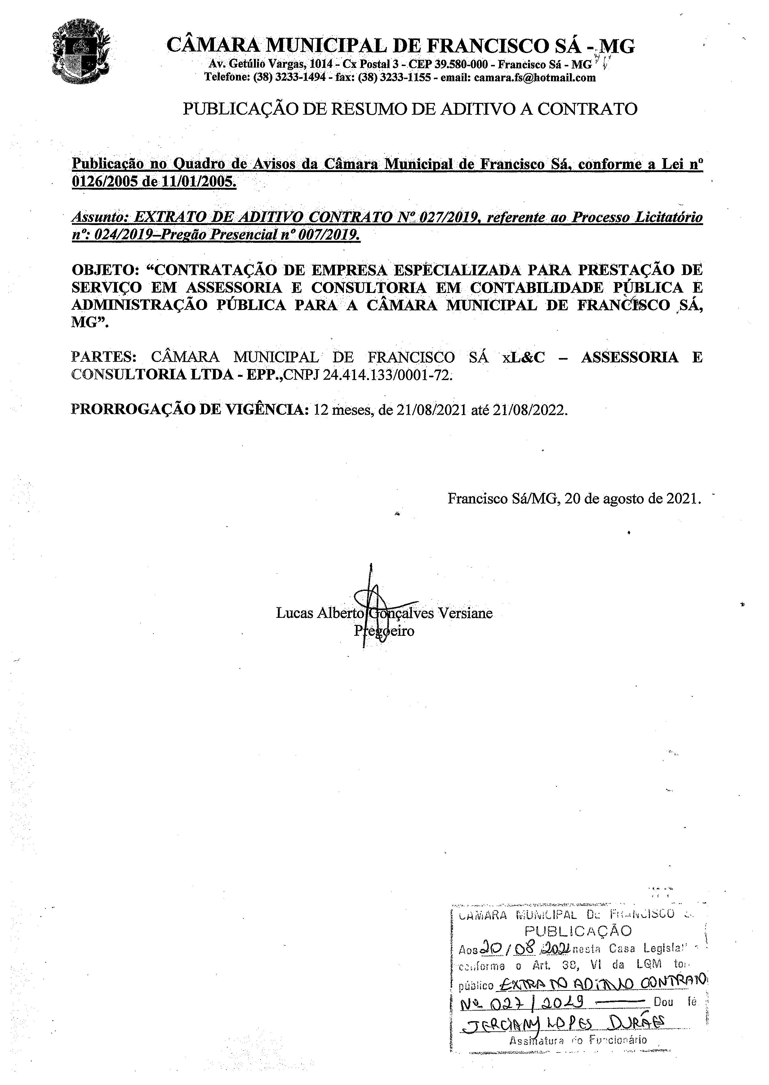 Extrato de Publicação do 2º Termo Aditivo ao Contrato N.º 027/2019 - Processo Licitatório N.º 024/2019 - Pregão Presencial N.º 007/2019 - Contratada: L&C - Assessoria e Consultoria Ltda. - CNPJ: 24.414.133/0001-72
