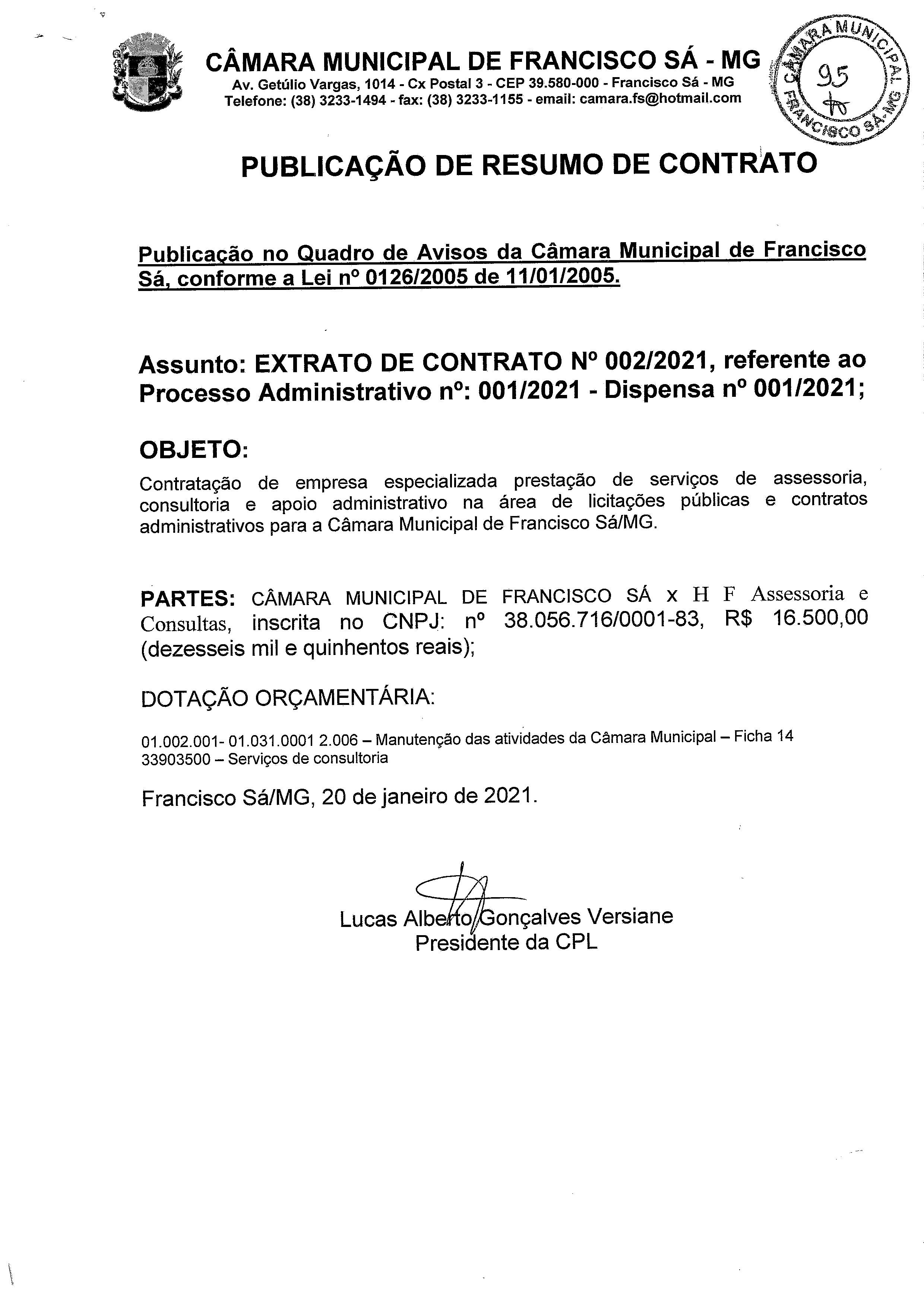 Extrato CTR N.º 002/2021 (PL 001/2021 Disp. 001/2021 - Assessoria em Licitações)