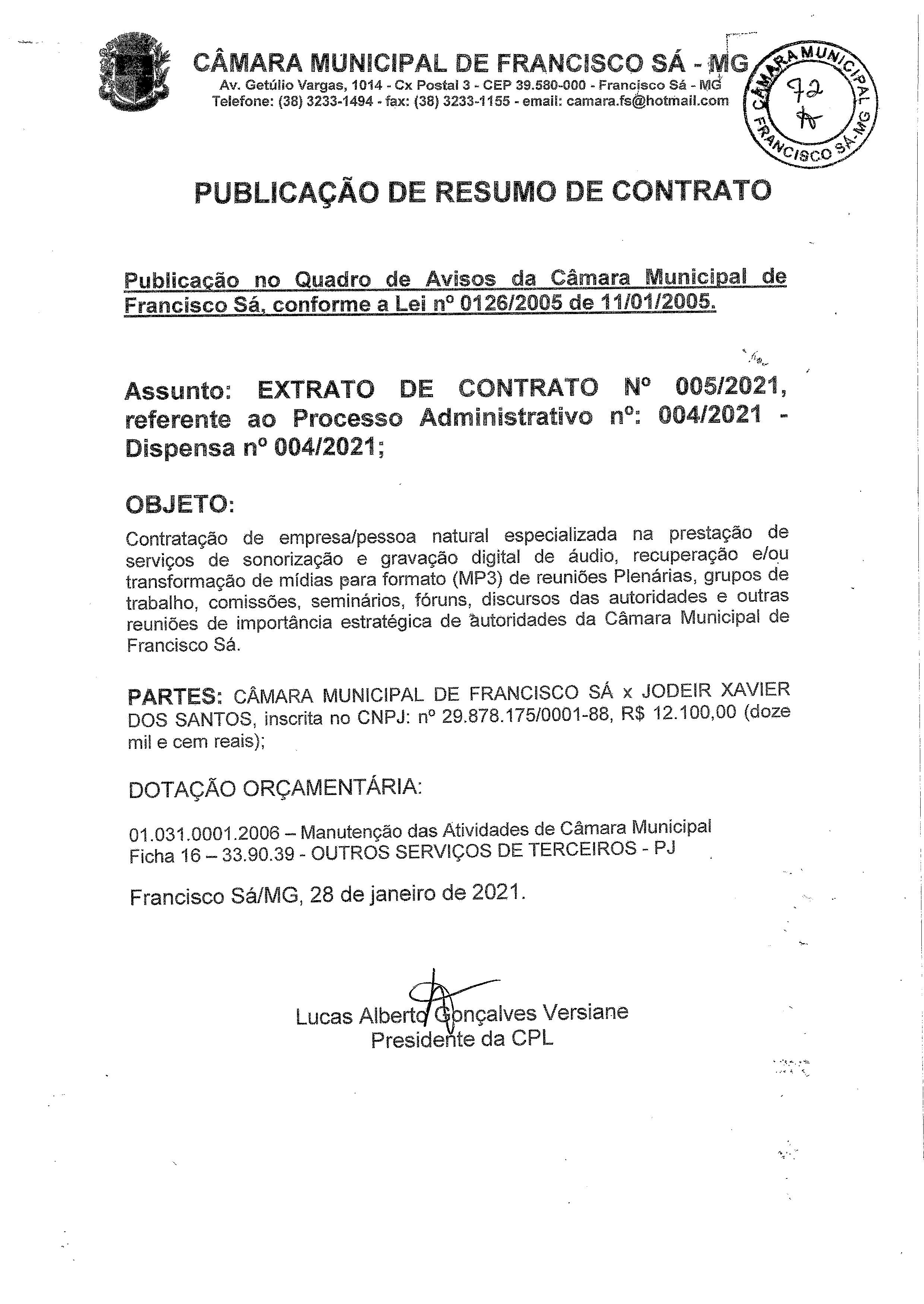 Extrato de Publicação do Contrato N.º 005/2021 - Processo Licitatório N.º 004/2021 - Dispensa N.º 004/2021 - Contratado: Jodeir Xavier dos Santos