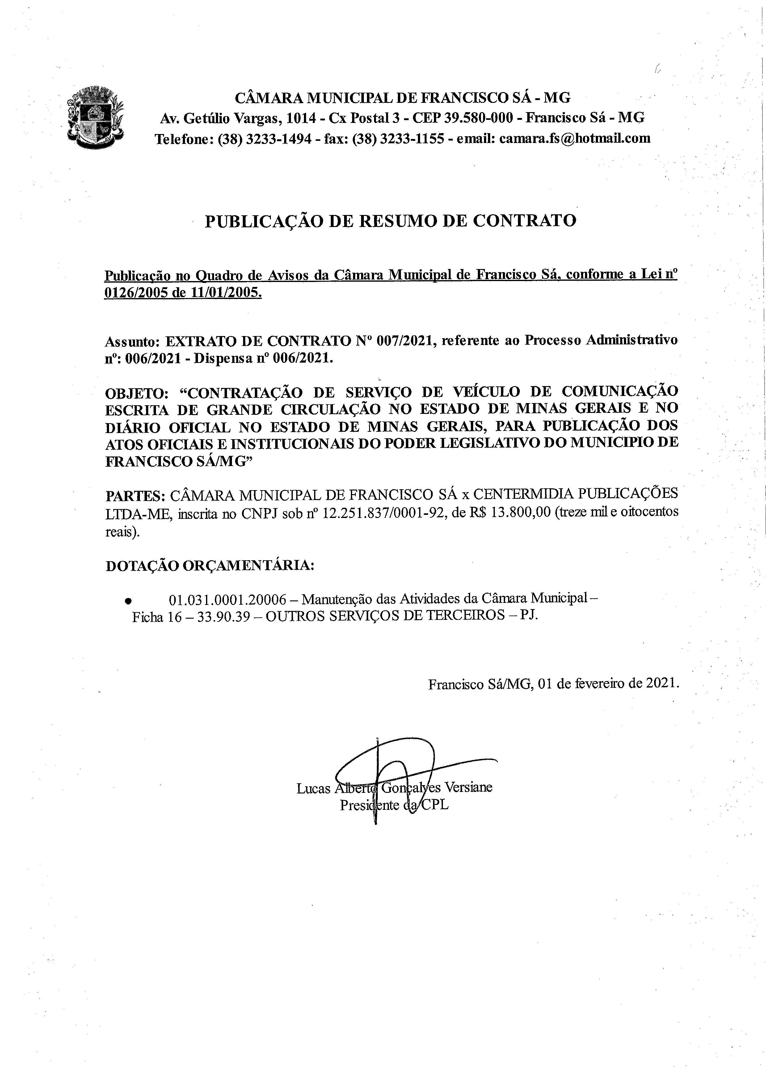 Extrato de Publicação do Contrato N.º 007/2021 - Processo Licitatório N.º 006/2021 - Dispensa N.º 006/2021 - Contratado: CenterMídia Publicações Ltda. – ME.