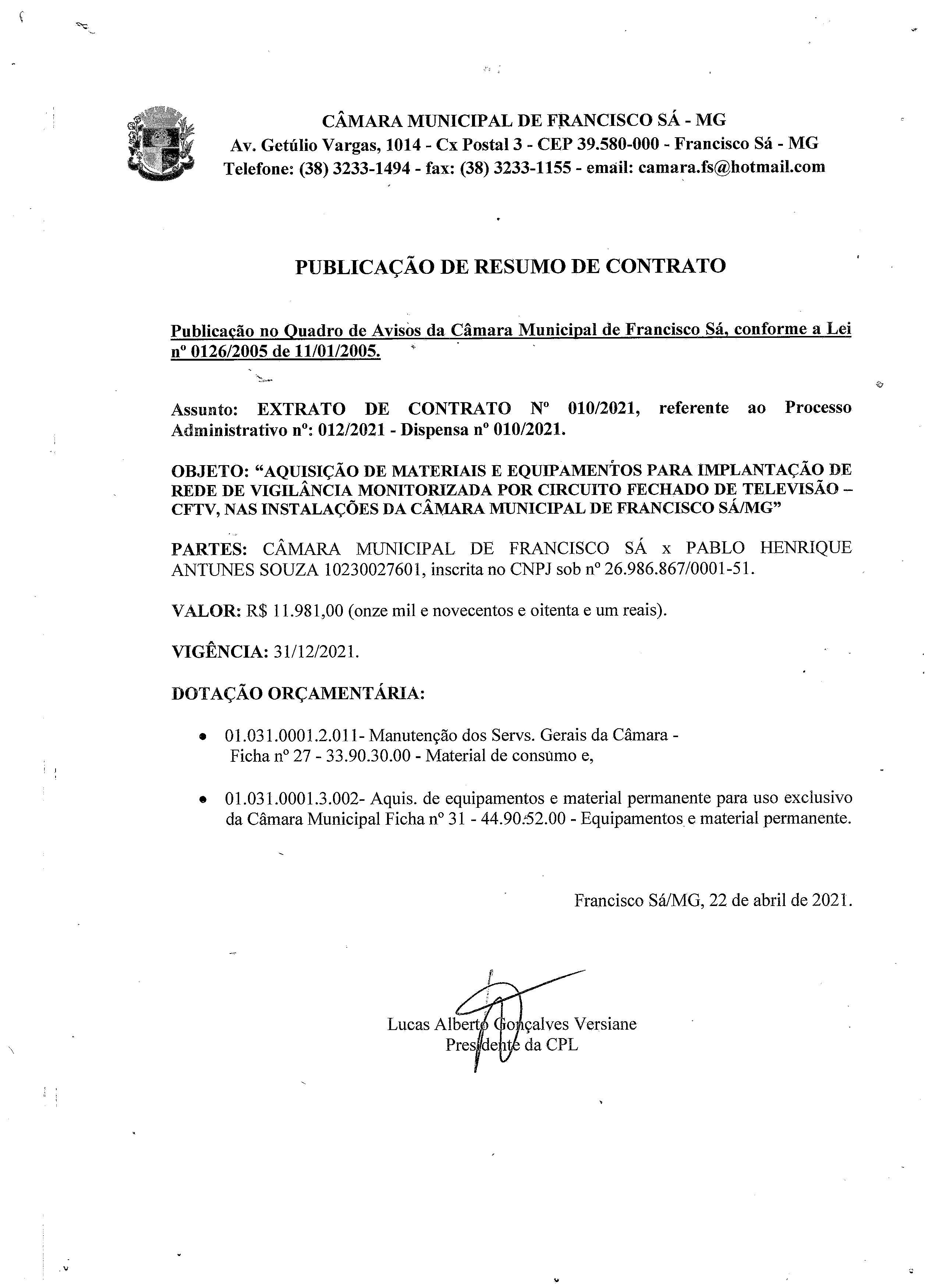 Extrato CTR N.º 010/2021 (PL 012/2021 Disp. 010/2021 - Monitoramento CFTV - Câmeras)
