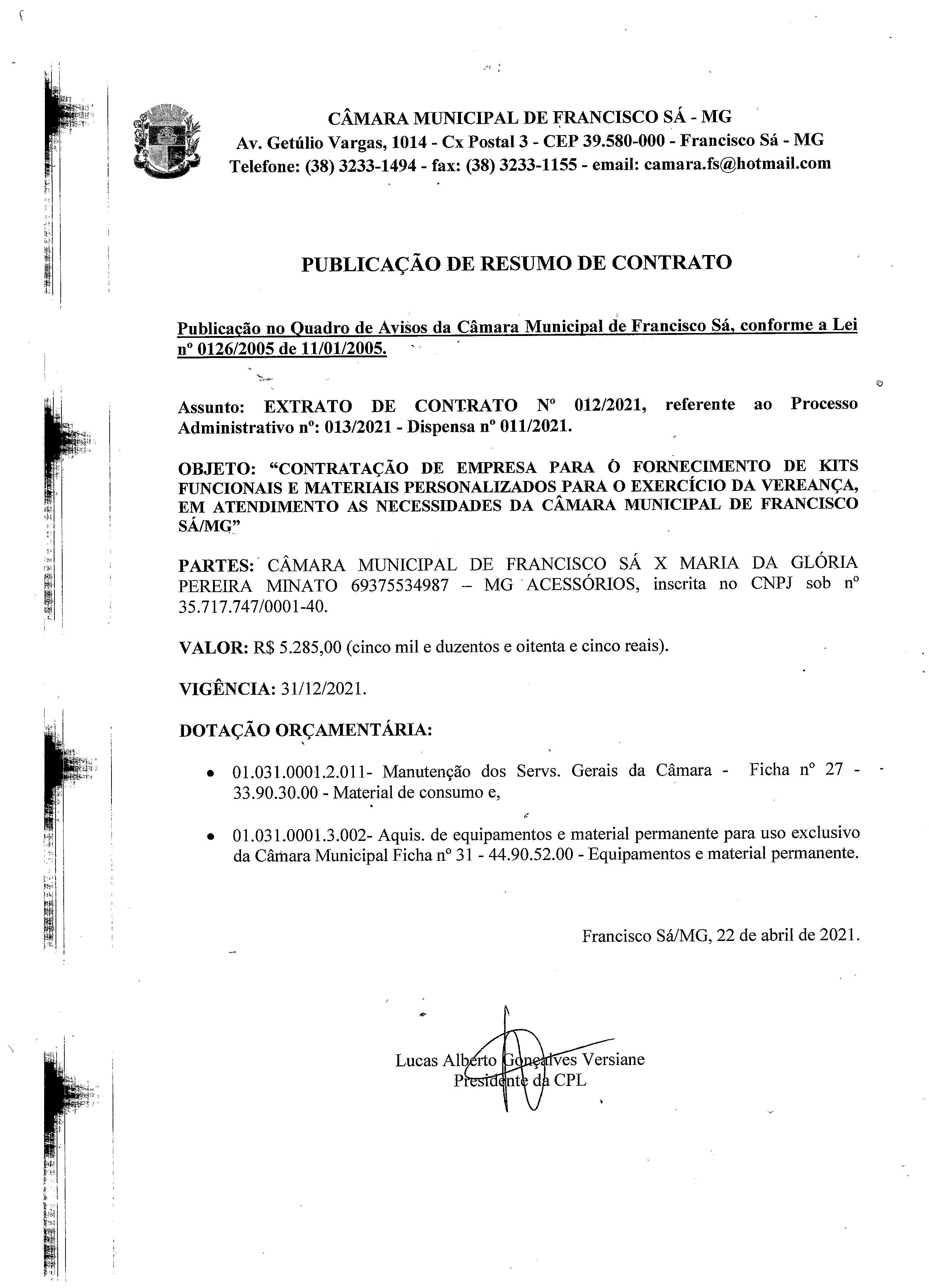 Extrato de Publicação do Contrato N.º 012/2021 - Processo Licitatório N.º 013/2021 - Dispensa N.º 011/2021 - Contratado: Maria da Glória Pereira Minato MG Acessórios.