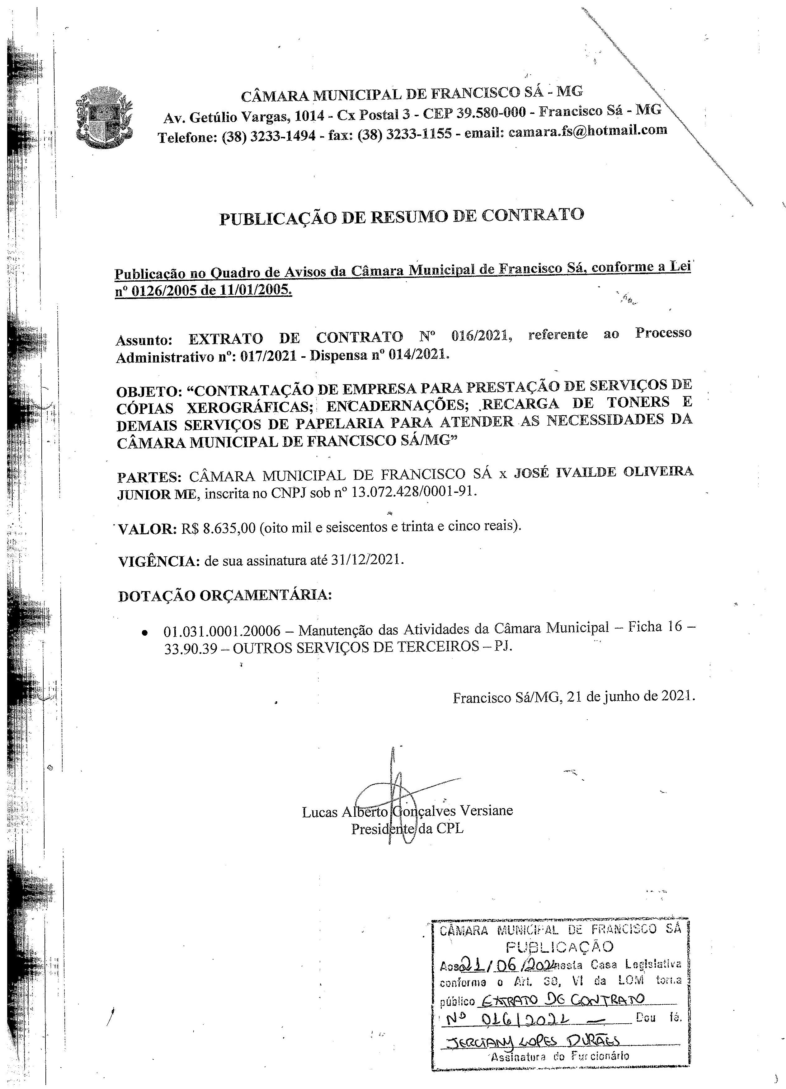 Extrato de Publicação do Contrato N.º 016/2021 - Processo Licitatório N.º 017/2021 - Dispensa N.º 014/021 - Contratado: José Ivailde Oliveira Júnior – ME.