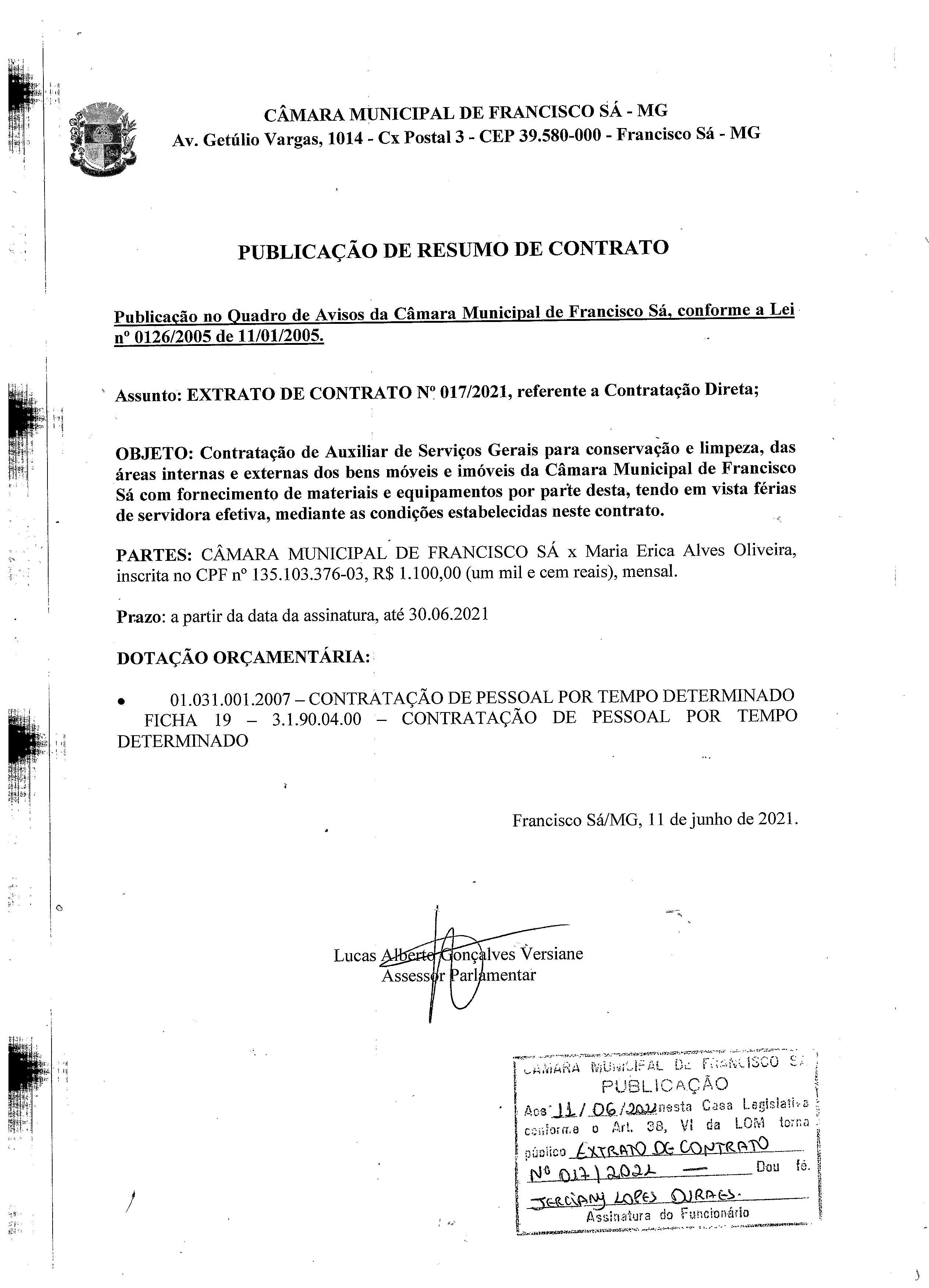 Extrato de Publicação do Contrato N.º 017/2021 - Contratação: Direta - Cargo: Auxiliar de Serviços Gerais - Contratada: Maria Érica Alves Oliveira.