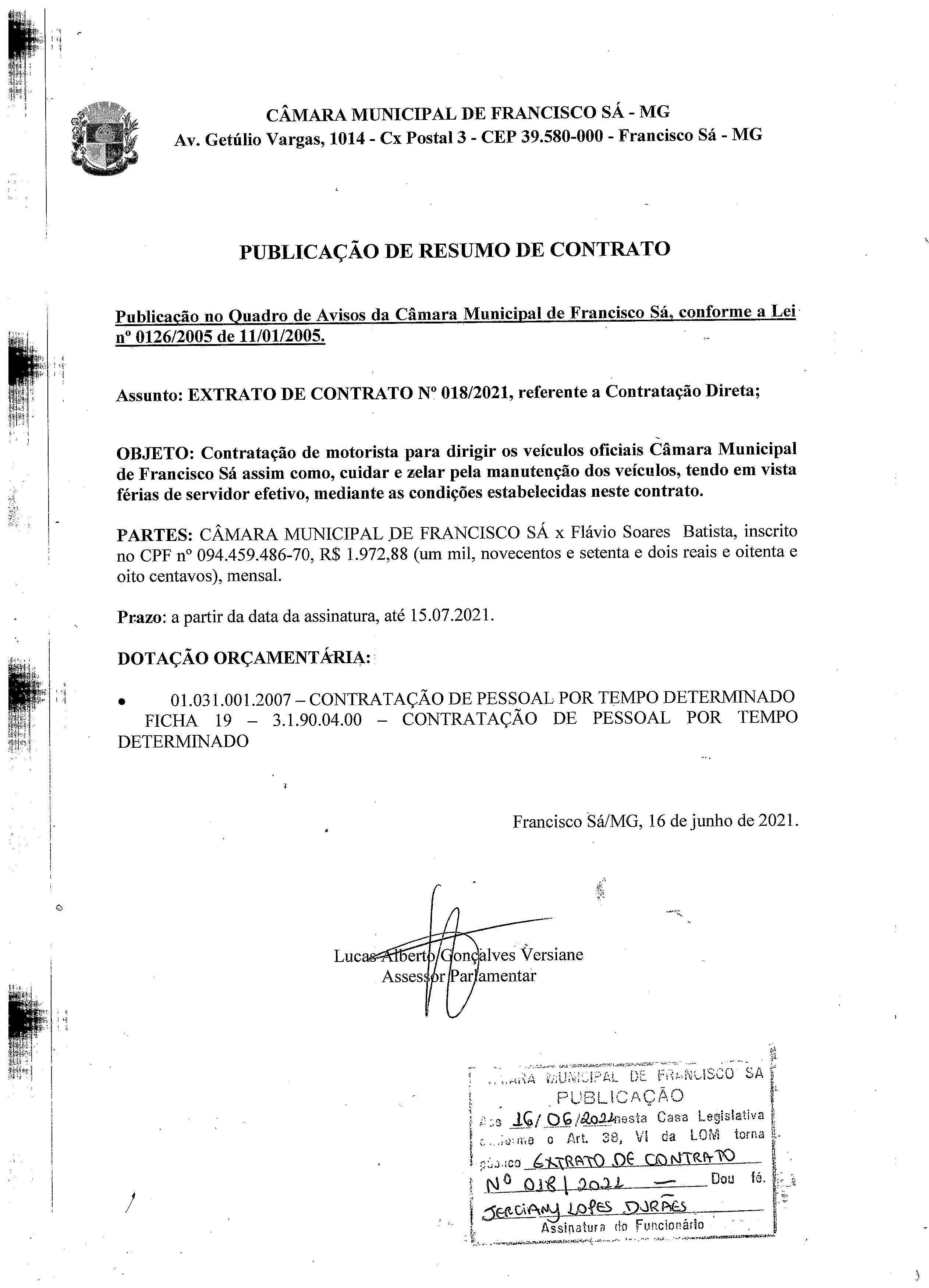 Extrato de Publicação do Contrato N.º 018/2021 - Contratação: Direta - Cargo: Motorista - Contratado: Flávio Soares Batista.