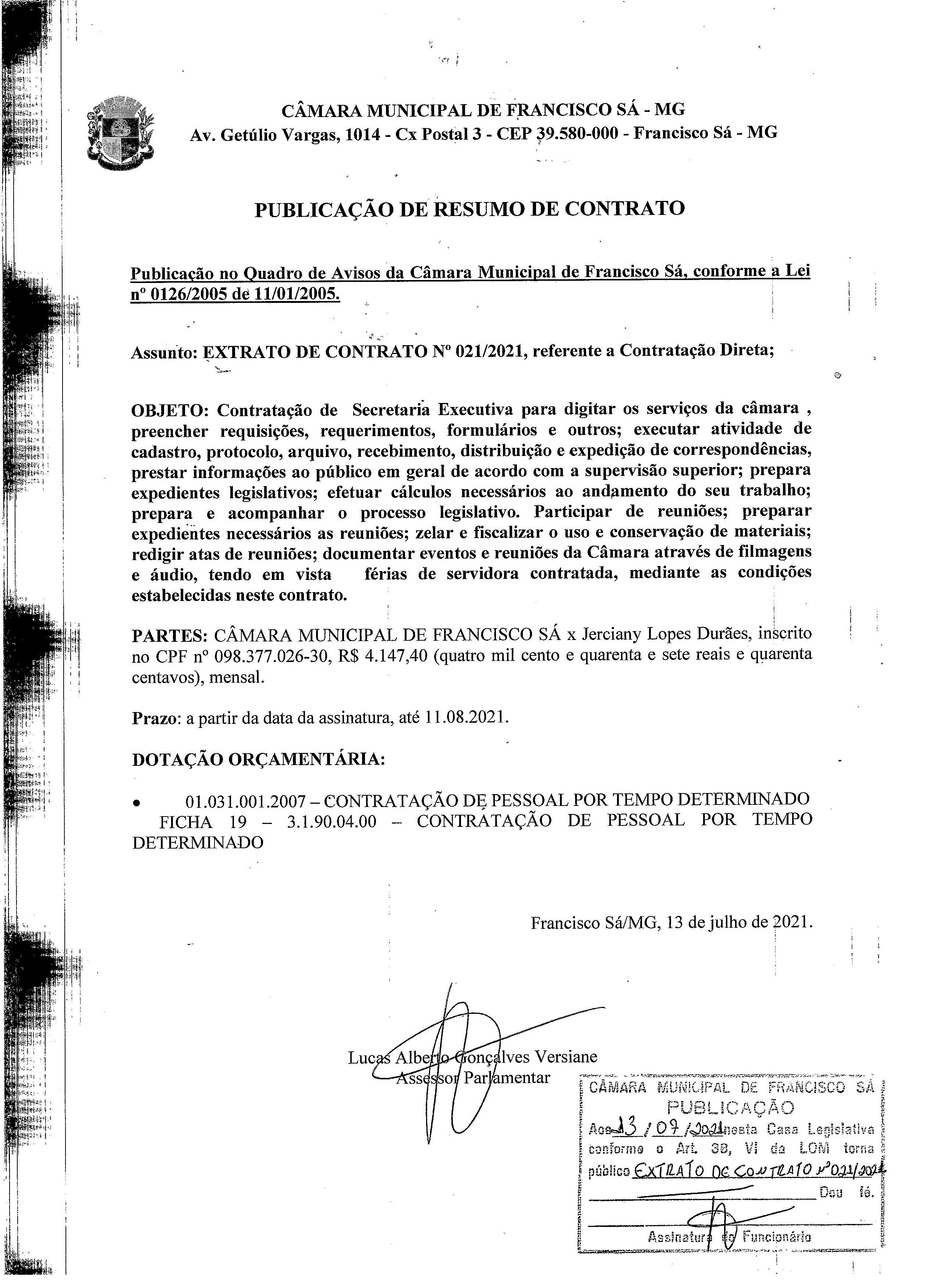 Extrato de Publicação do Contrato N.º 021/2021 - Contratação: Direta - Cargo: Secretário Executivo - Contratada: Jerciany Lopes Durães.
