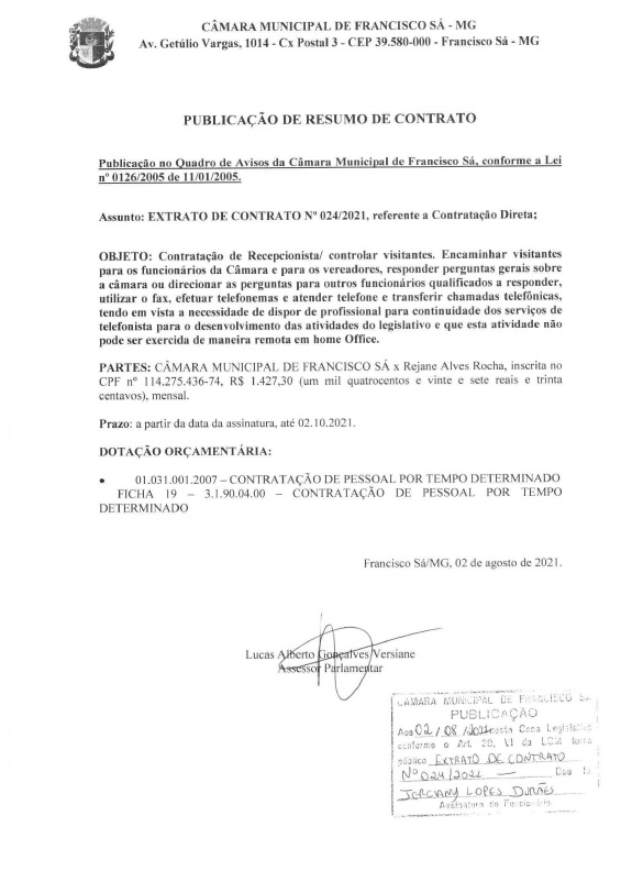 Extrato de Publicação do Contrato N.º 024/2021 - Contratação: Direta - Cargo: Telefonista/Recepcionista - Contratada: Rejane Alves Rocha.