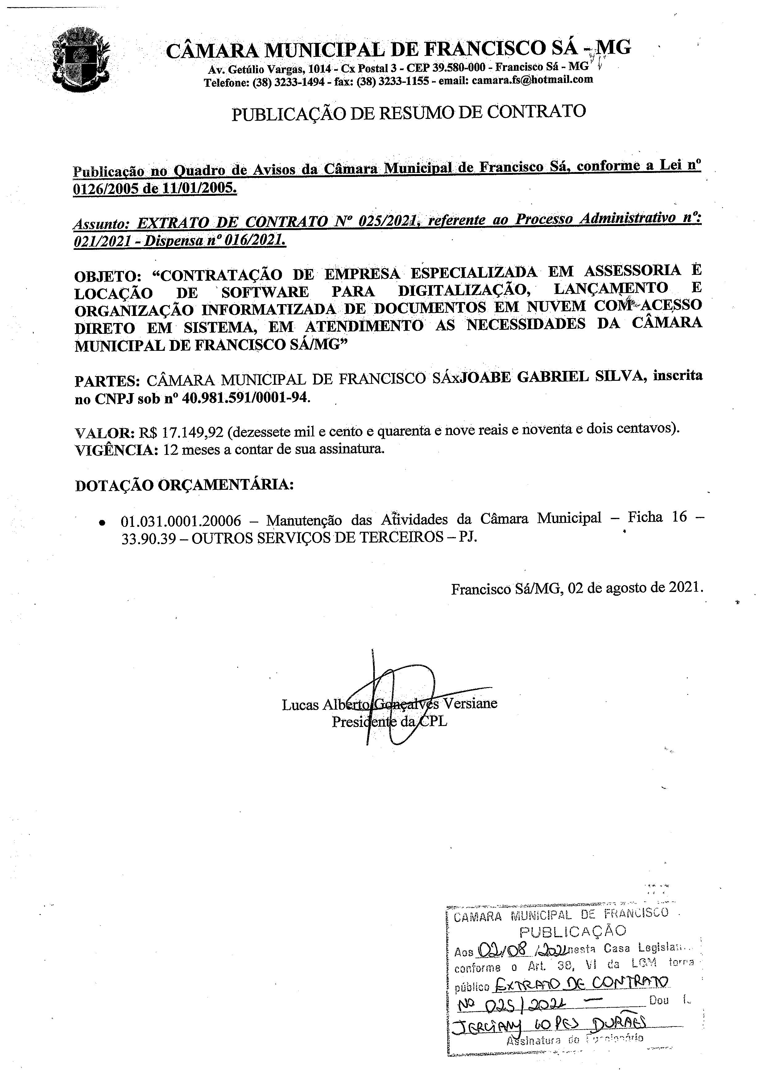 Extrato de Publicação do Contrato N.º 025/2021 - Processo Licitatório N.º 021/2021 - Dispensa N.º 016/021 - Contratado: Joabe Gabriel Silva. - CNPJ: 40.981.591/0001-94