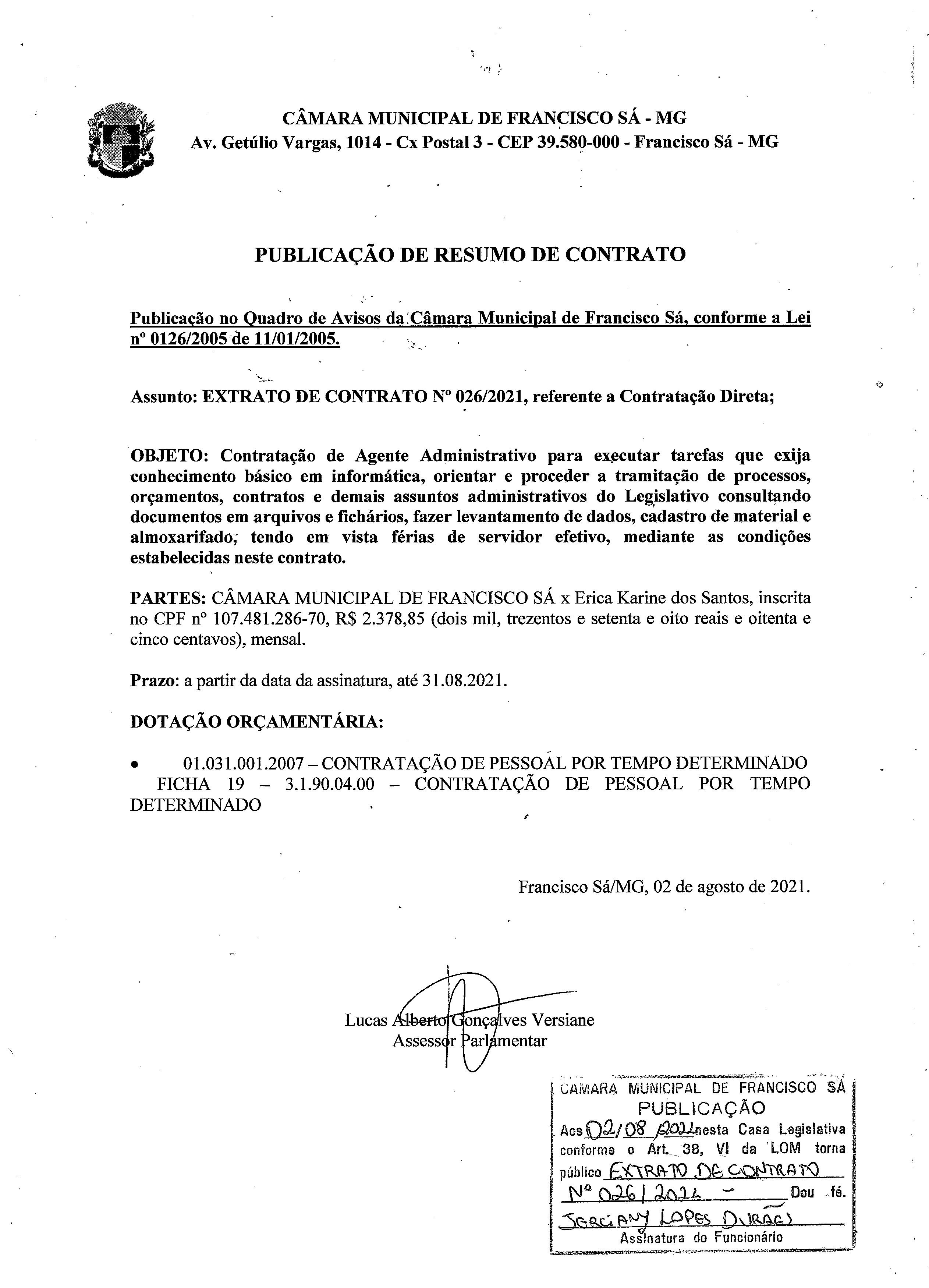 Extrato de Publicação do Contrato N.º 026/2021 - Contratação: Direta - Cargo: Agente Administrativo - Contratada: Érika Karine dos Santos.