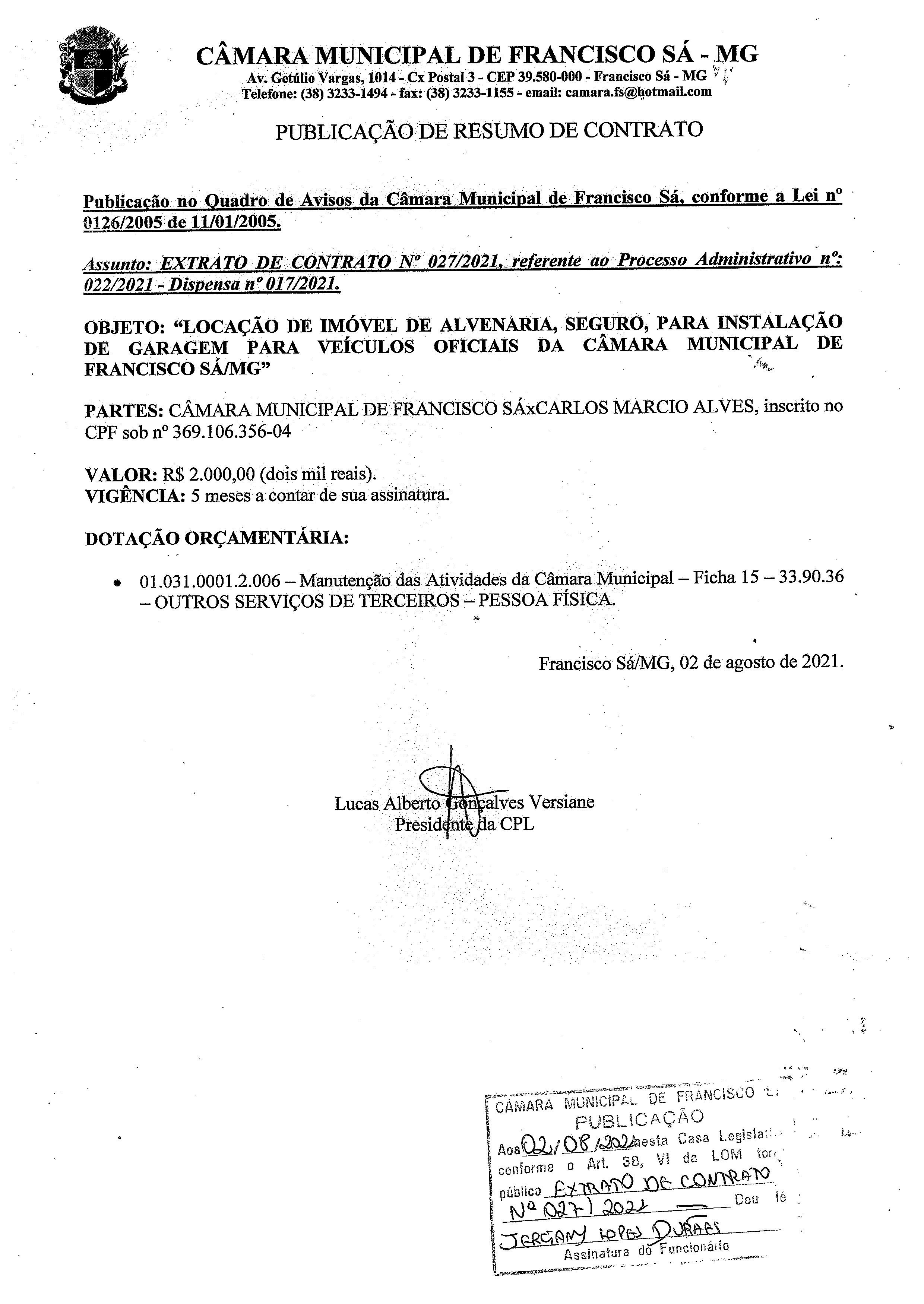 Extrato de Publicação do Contrato N.º 027/2021 - Processo Licitatório N.º 022/2021 - Dispensa N.º 017/021 - Contratado: Carlos Márcio Alves. - CPF: 369.106.356-04