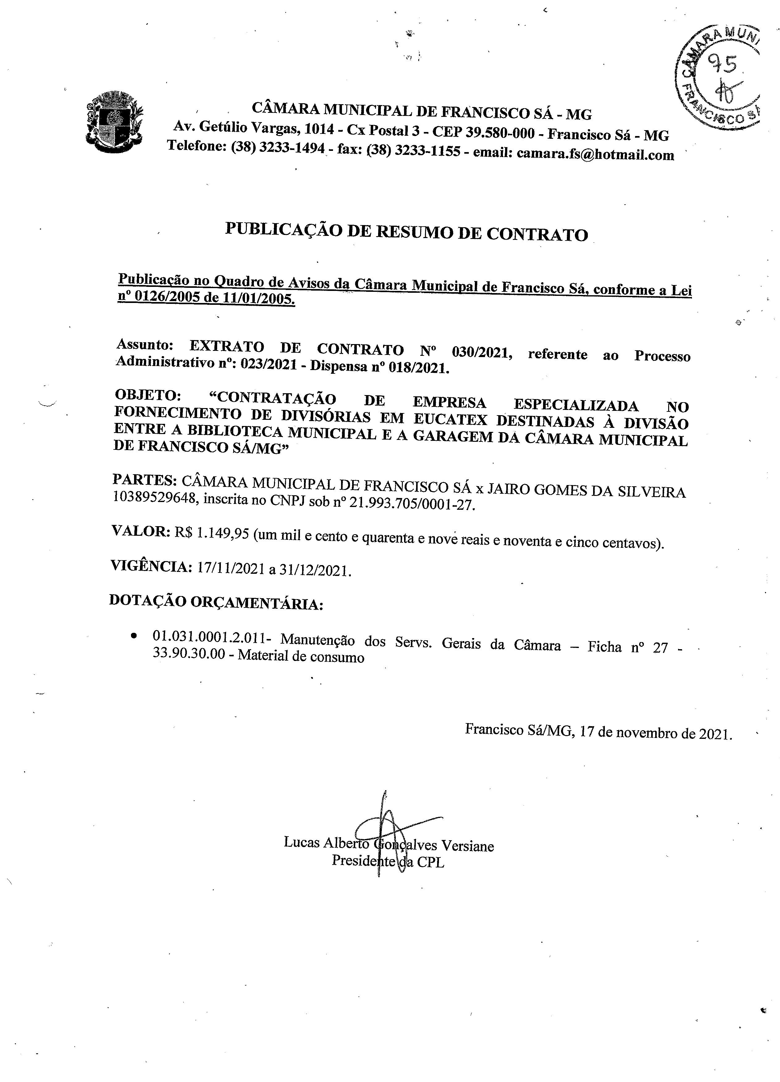 Extrato CTR N.º 030/2021 (PL 023/2021 Disp. 018/2021 - Fornecimento de divisórias de Eucatex)