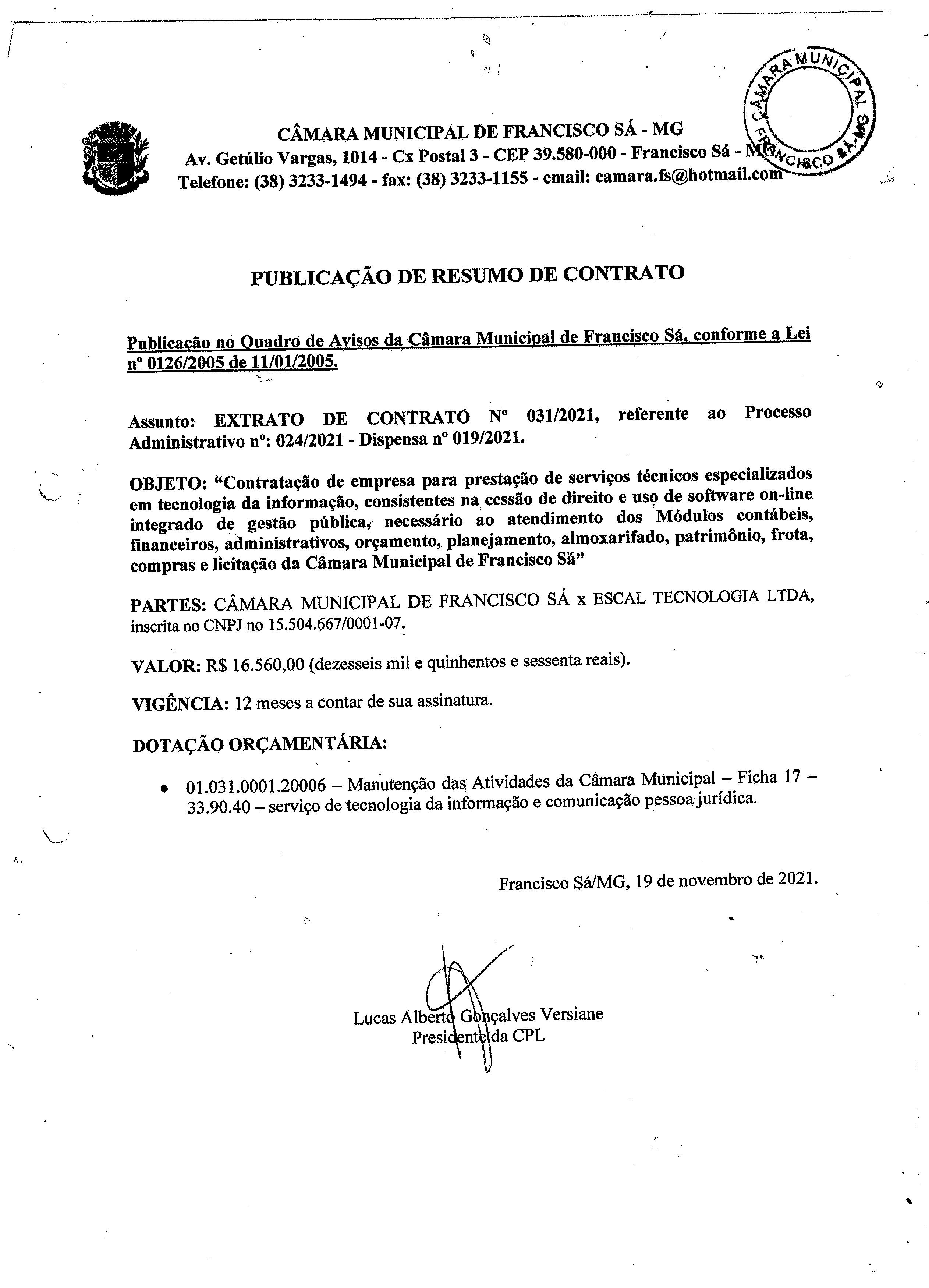 Extrato de Publicação do Contrato N.º 031/2021 - Processo Licitatório N.º 024/2021 - Dispensa N.º 019/2021 - Contratado: Escal Tecnologia Ltda. – CNPJ: 15.504.667/0001-07.