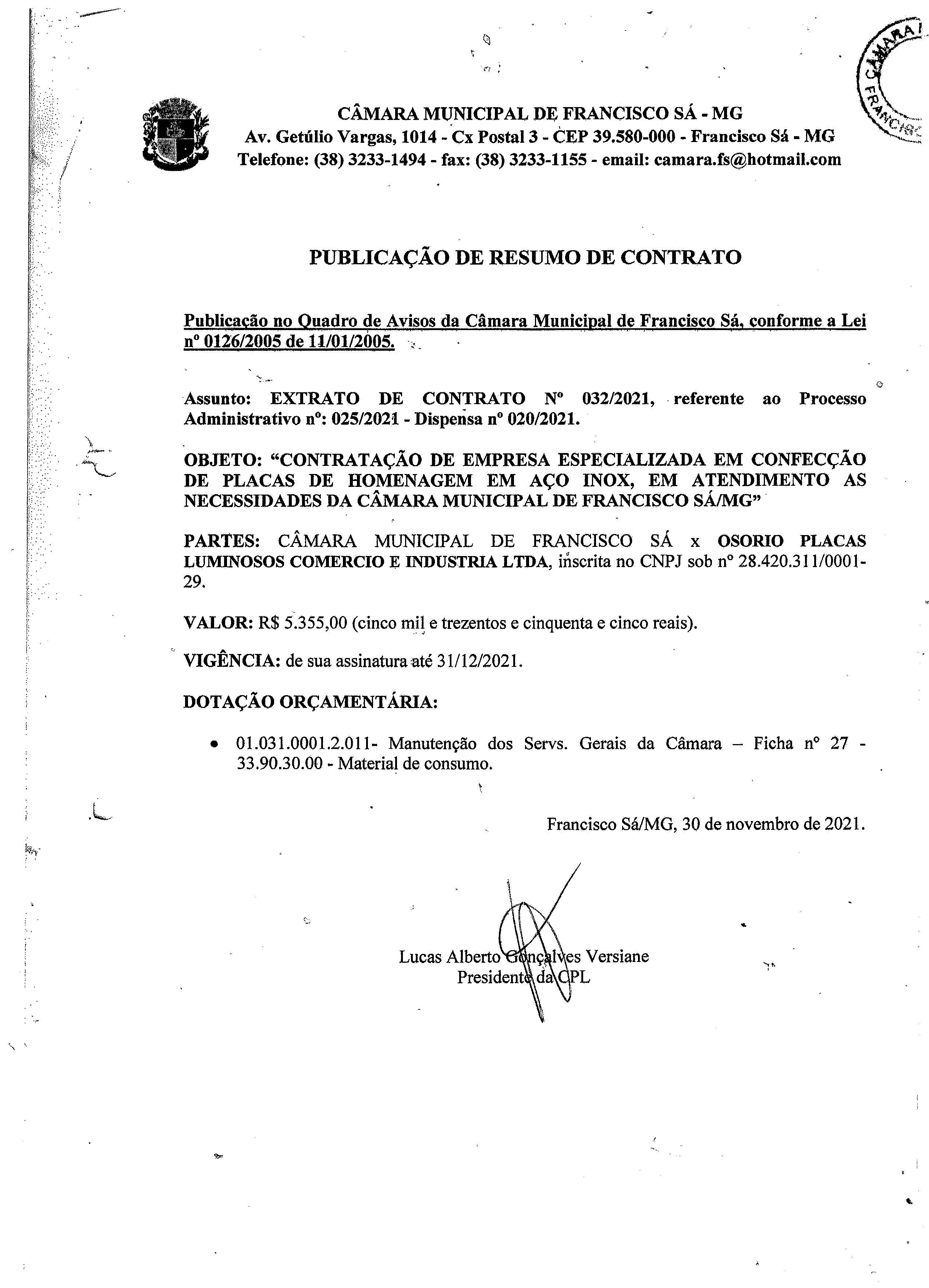 Extrato de Publicação do Contrato N.º 032/2021 - Processo Licitatório N.º 025/2021 - Dispensa N.º 020/2021 - Contratado: Osório Placas Luminosos Comércio e Indústria Ltda. – CNPJ: 28.420.311/0001-29.