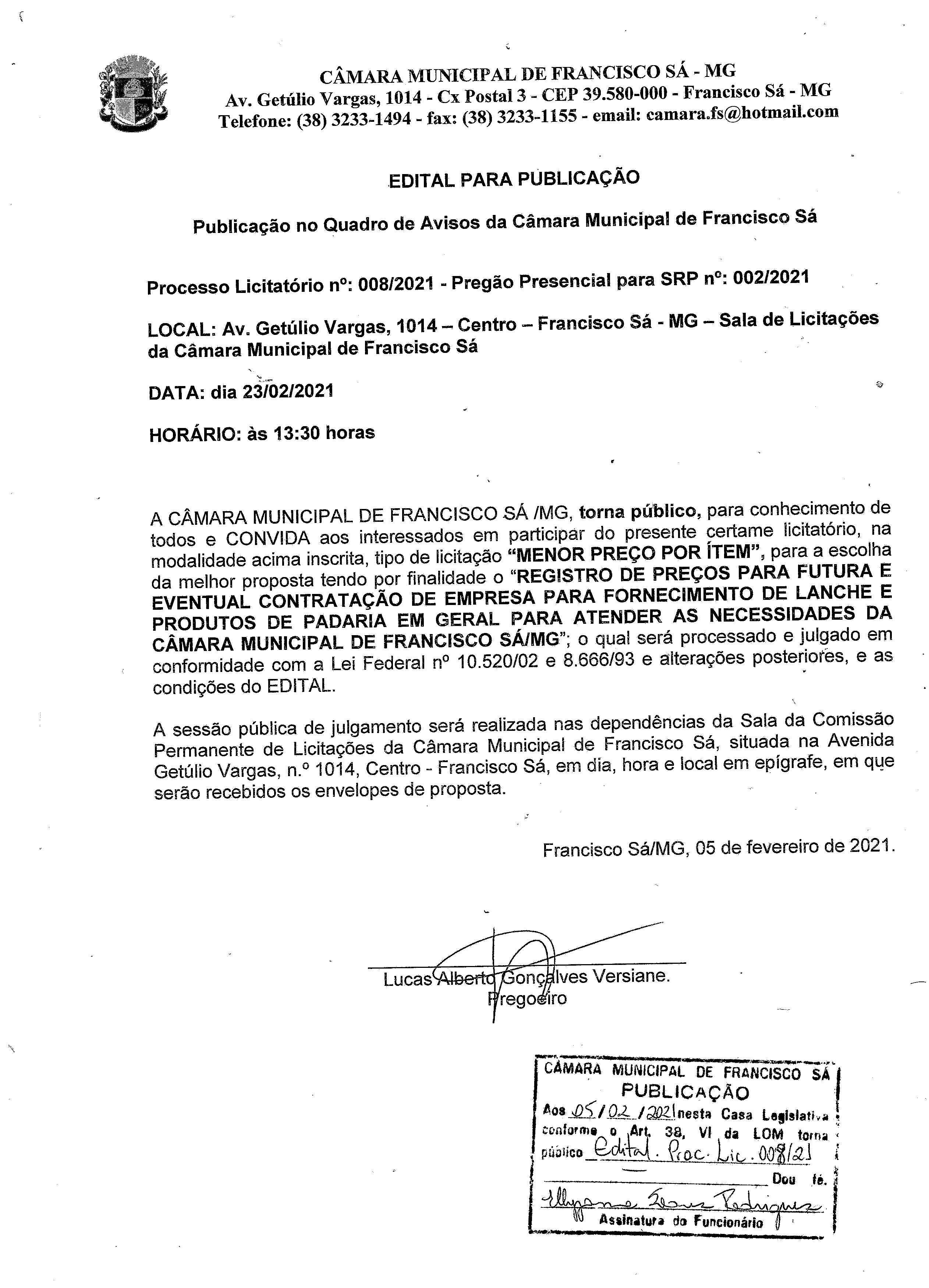 Extrato de Publicação do Procedimento Licitatório 08/2021 - Pregão Presencial 02/2021 – Padaria