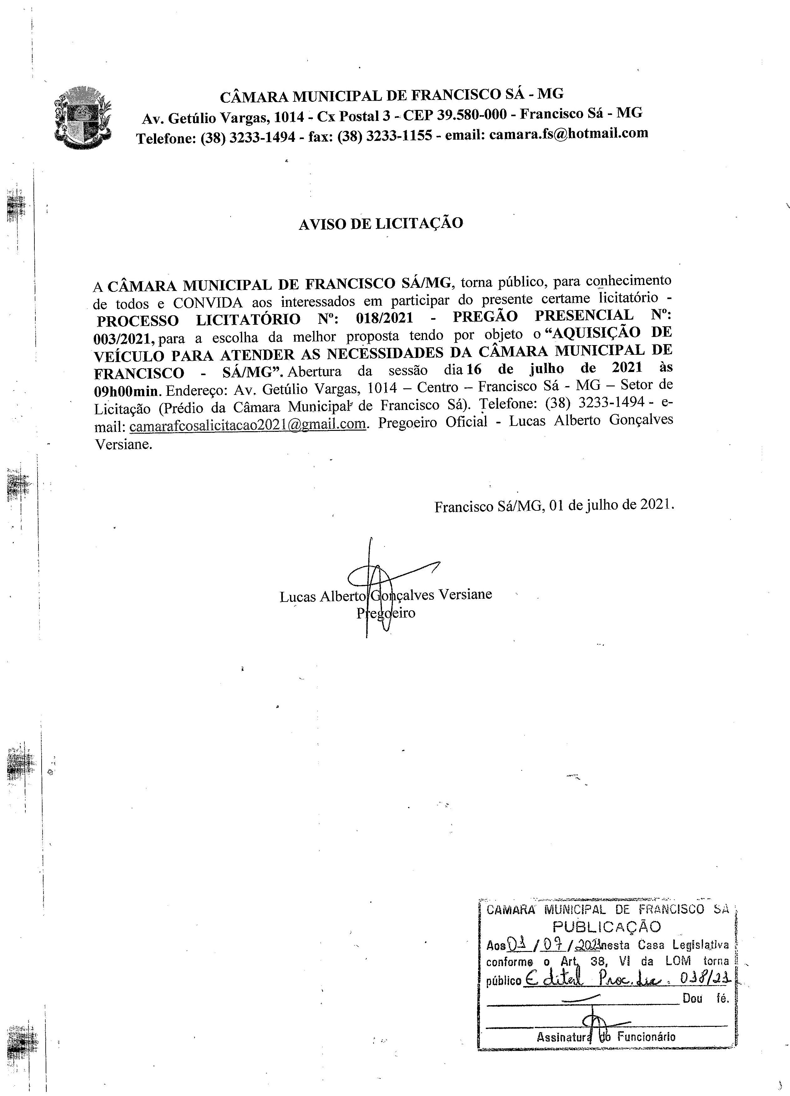 Extrato de Publicação do Procedimento Licitatório 18/2021 - Pregão Presencial 03/2021 – Veículo