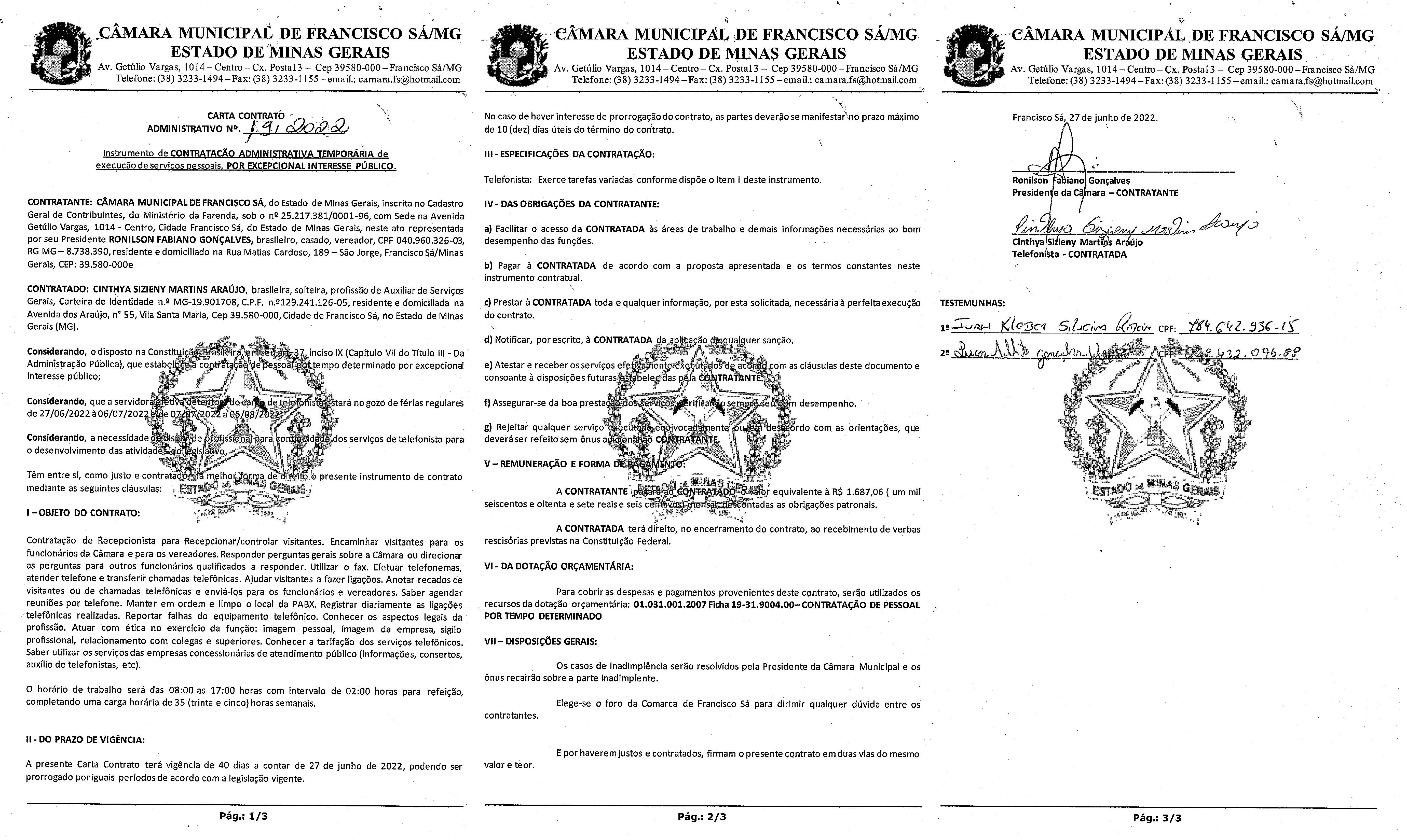 Publicação da Cópia do Contrato N.º 019/2022 - Contratação: Direta - Cargo: Auxiliar de Serviços Gerais - Contratada: Cinthya Sizieny Martins Araújo.