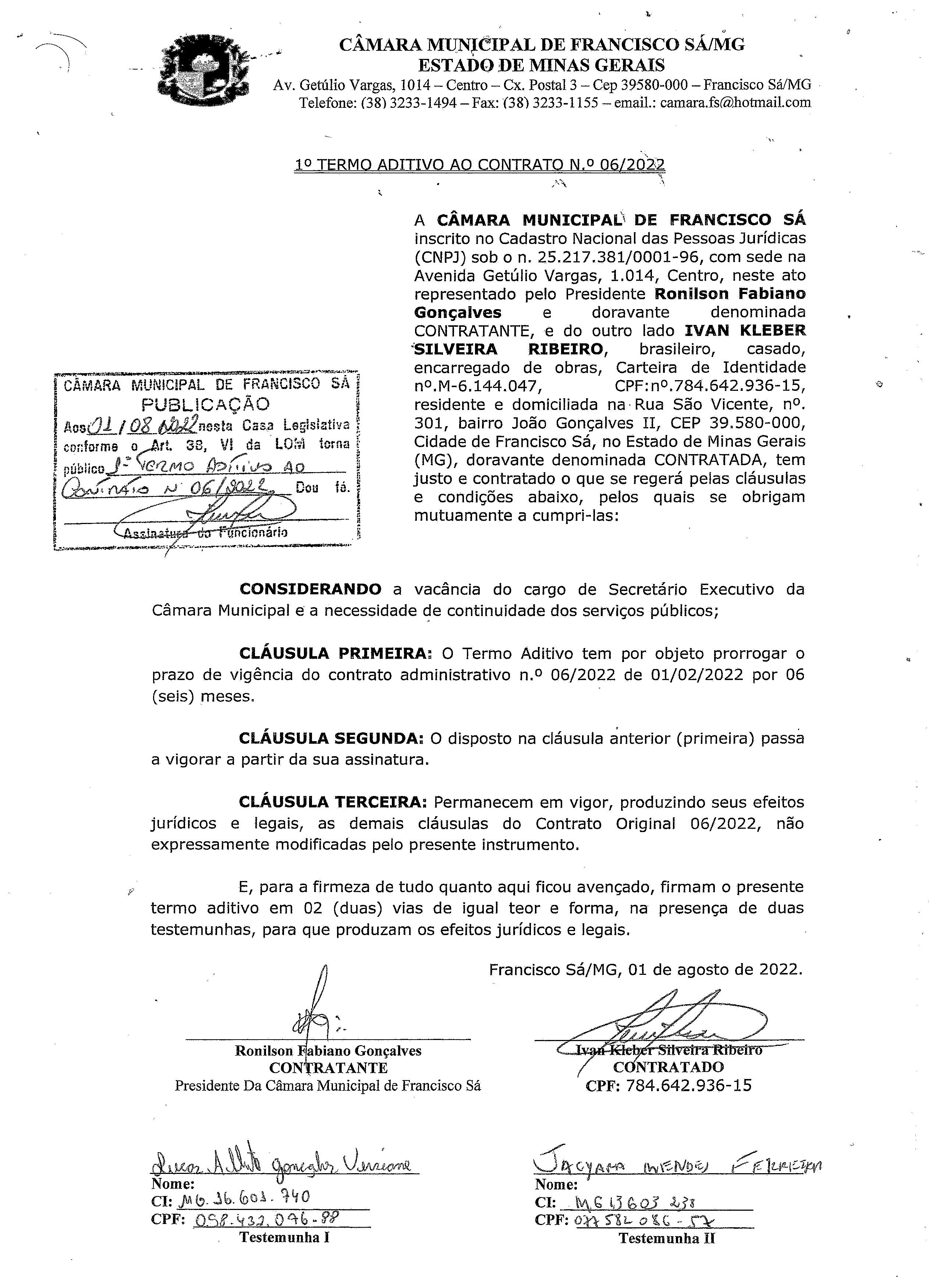 Extrato de Publicação do 1º Termo Aditivo ao Contrato N.º 006/2022 - Contratação: Direta - Cargo: Secretário Executivo - Contratado: Ivan Kleber Silveira Ribeiro.