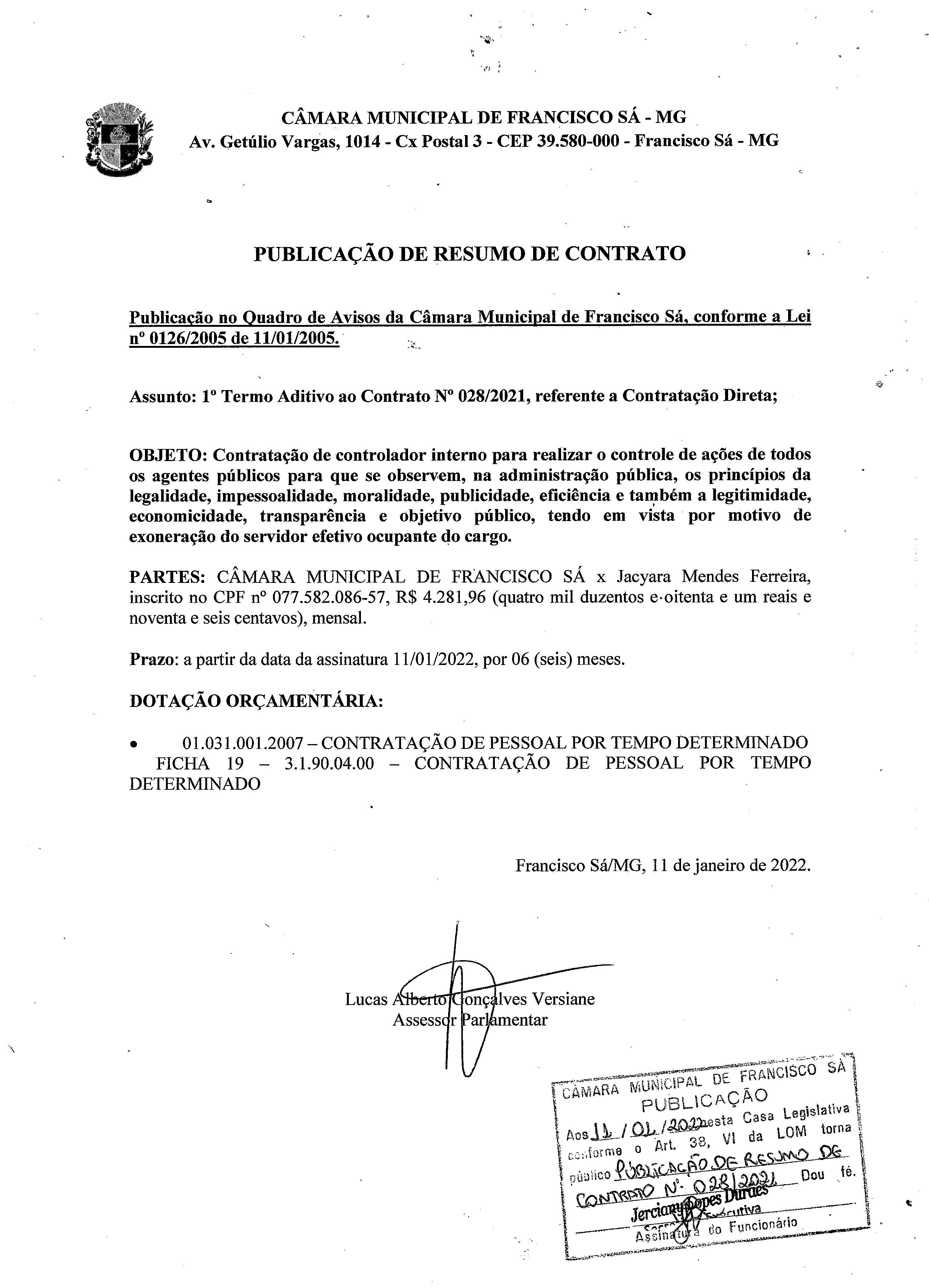 Extrato de Publicação do 1º Termo Aditivo ao Contrato N.º 028/2021 - Contratação: Direta - Cargo: Controlador Interno - Contratada: Jacyara Mendes Ferreira.