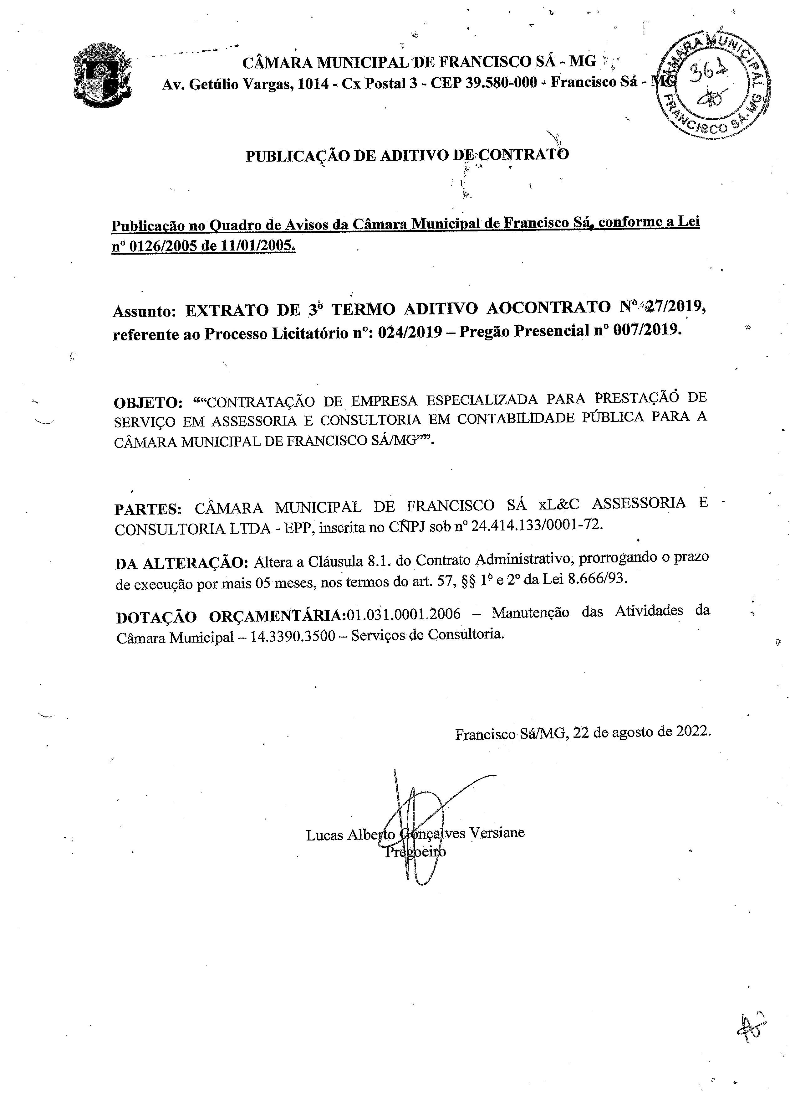 Extrato de Publicação do 3º Termo Aditivo ao Contrato N.º 027/2019 - Processo Licitatório N.º 024/2019 - Pregão Presencial N.º 007/2019 - Contratada: L&C - Assessoria e Consultoria Ltda. - CNPJ: 24.414.133/0001-72