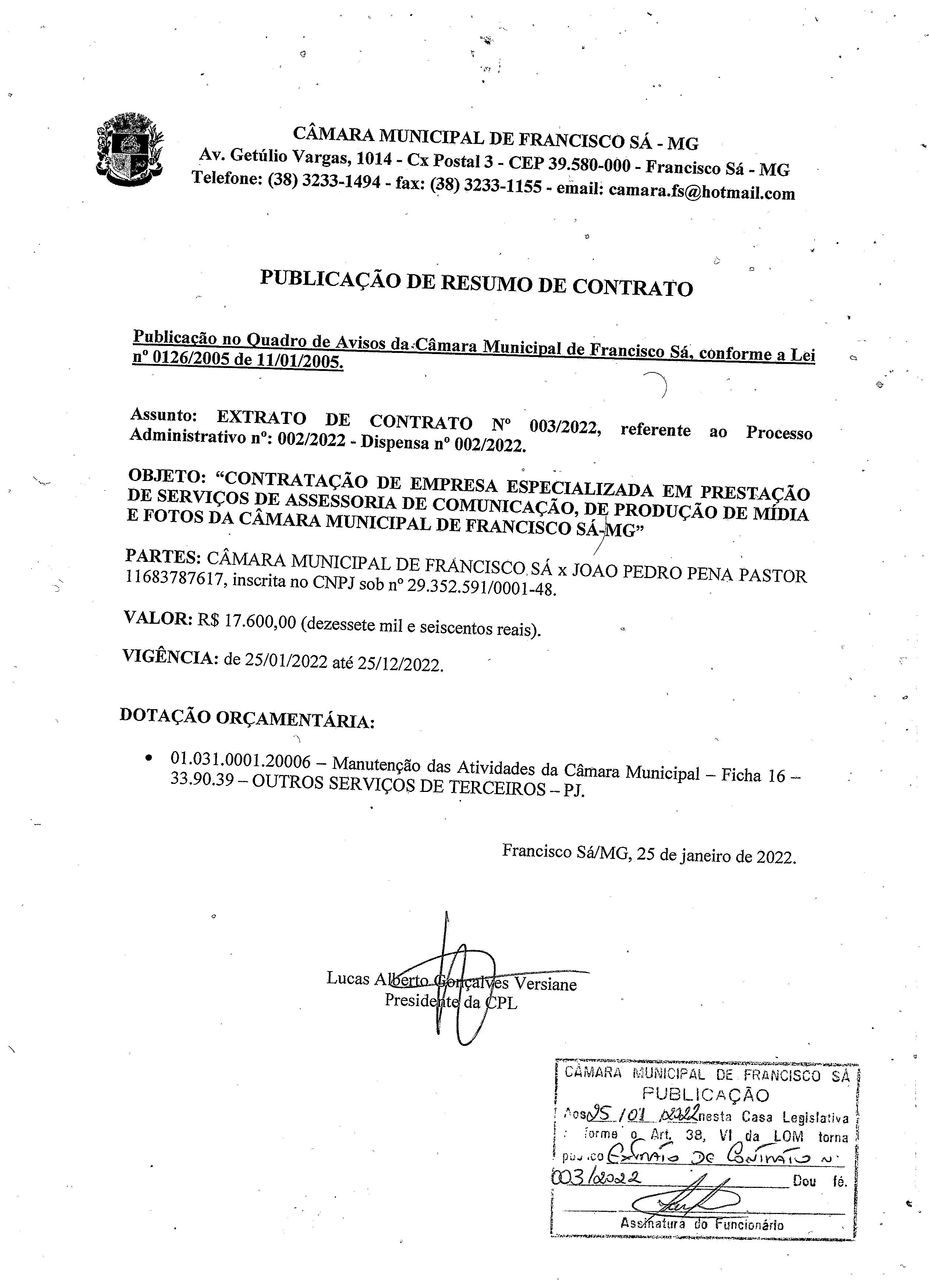 Extrato de Publicação do Contrato N.º 003/2022 - Processo Licitatório N.º 002/2022 - Dispensa N.º 002/2022 - Cargo: Assessoria em Comunicação. - Contratado: João Pedro Pena Pastor
