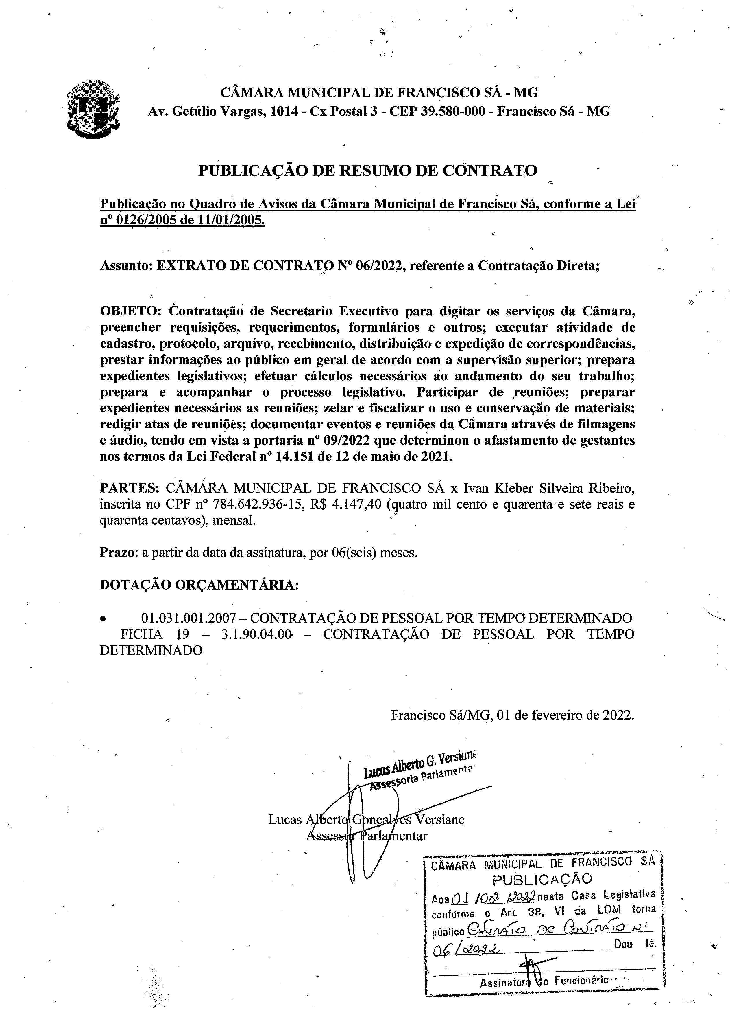 Extrato de Publicação do Contrato N.º 006/2022 - Contratação: Direta - Cargo: Secretário Executivo. – Contratado: Ivan Kleber Silveira Ribeiro