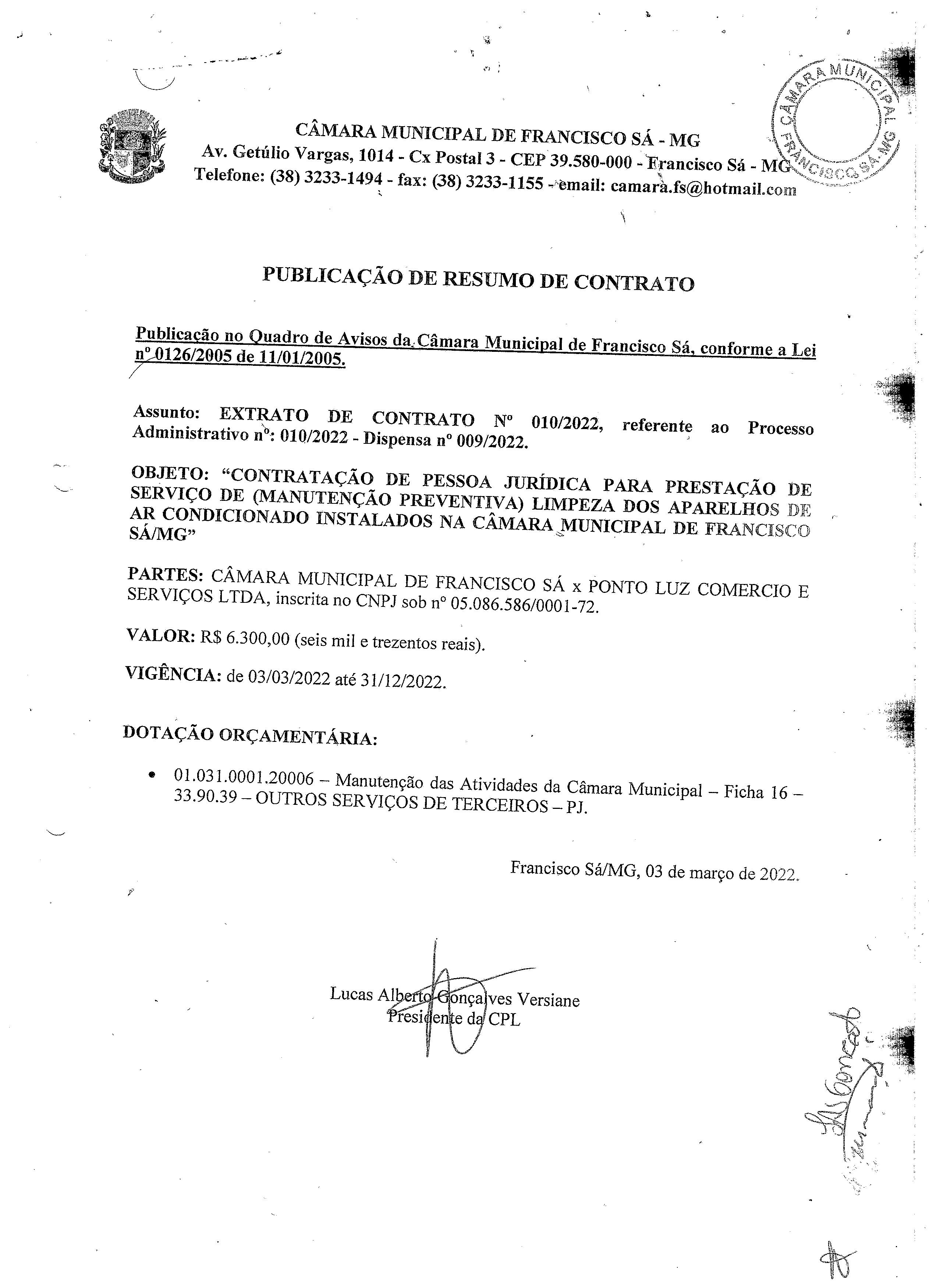 Extrato de Publicação do Contrato N.º 010/2022 - Processo Licitatório N.º 010/2022 - Dispensa N.º 009/2022 - Contratado: Ponto Luz Comércio e Serviços Ltda.
