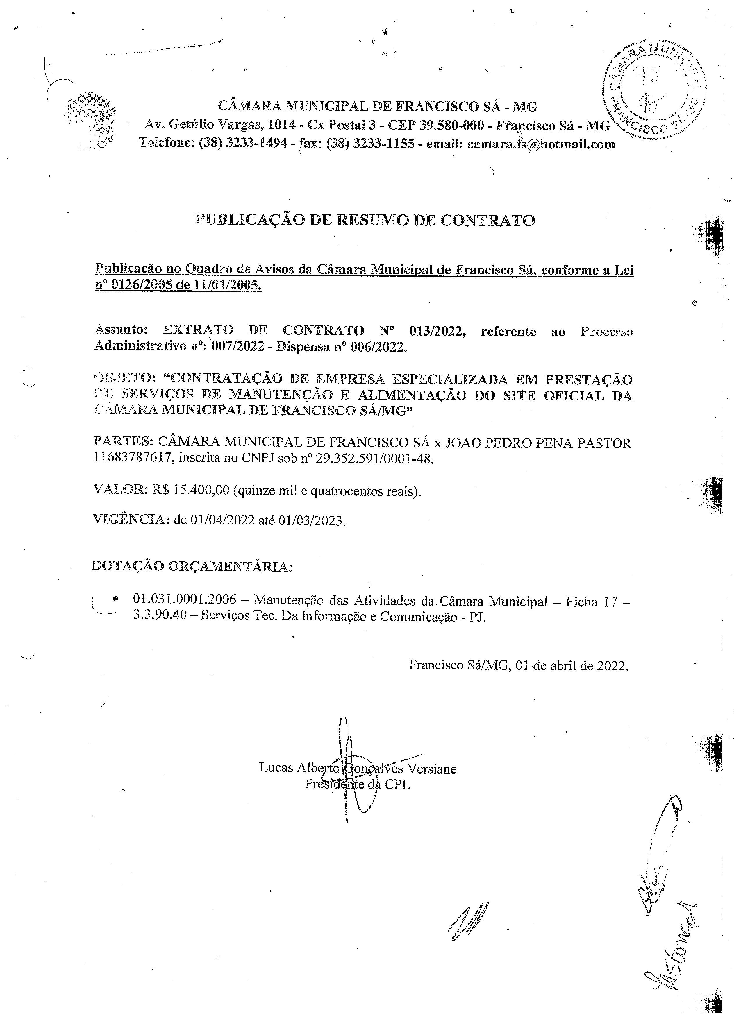 Extrato CTR N.º 013/2022 (PL 007/2022 Disp. 006/2022 - Manutenção e alimentação do site da Câmara)