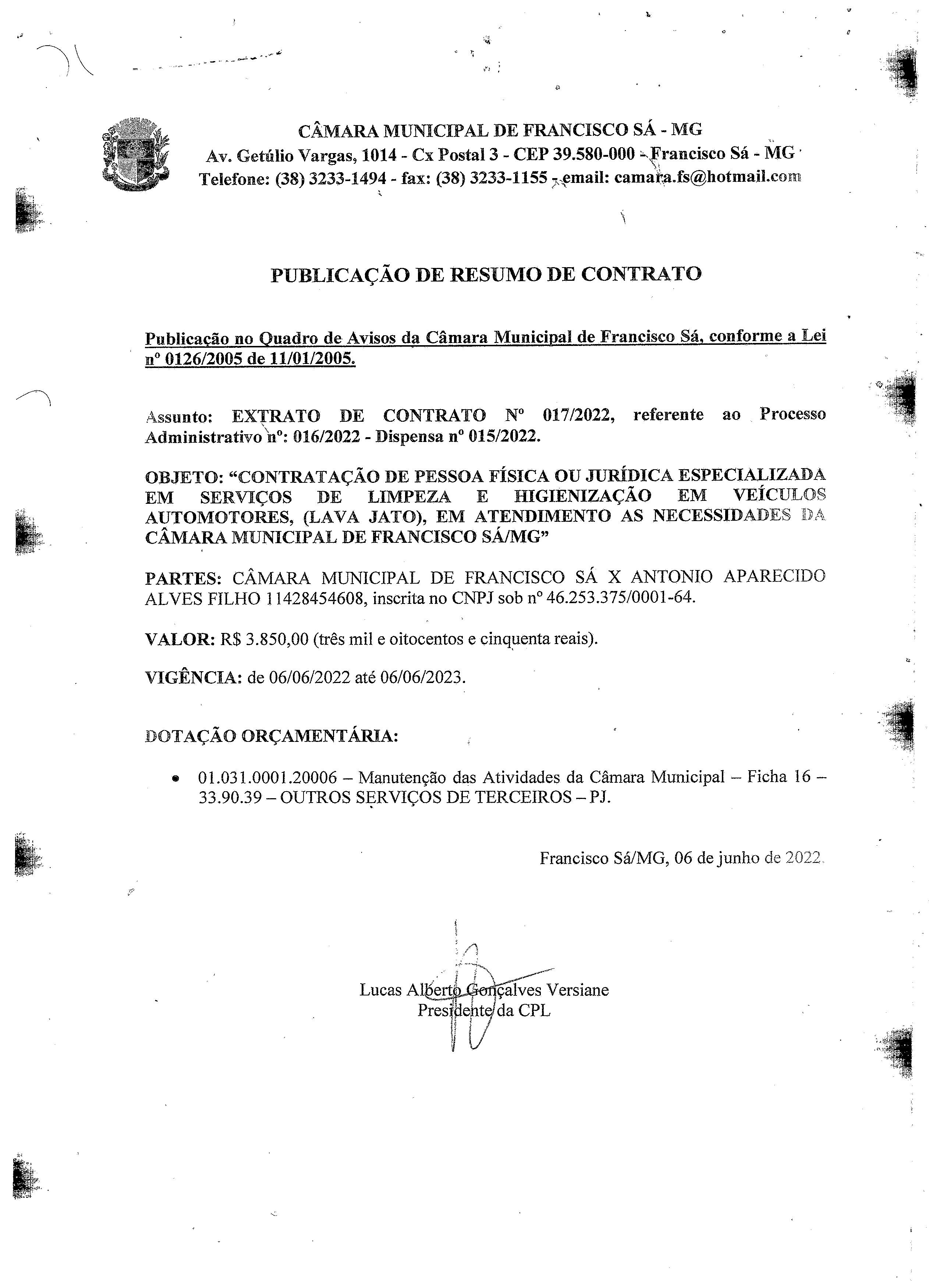 Extrato CTR N.º 016/2022 (PL 016/2022 Disp. 015/2022 - Limpeza dos Veículos da Câmara)