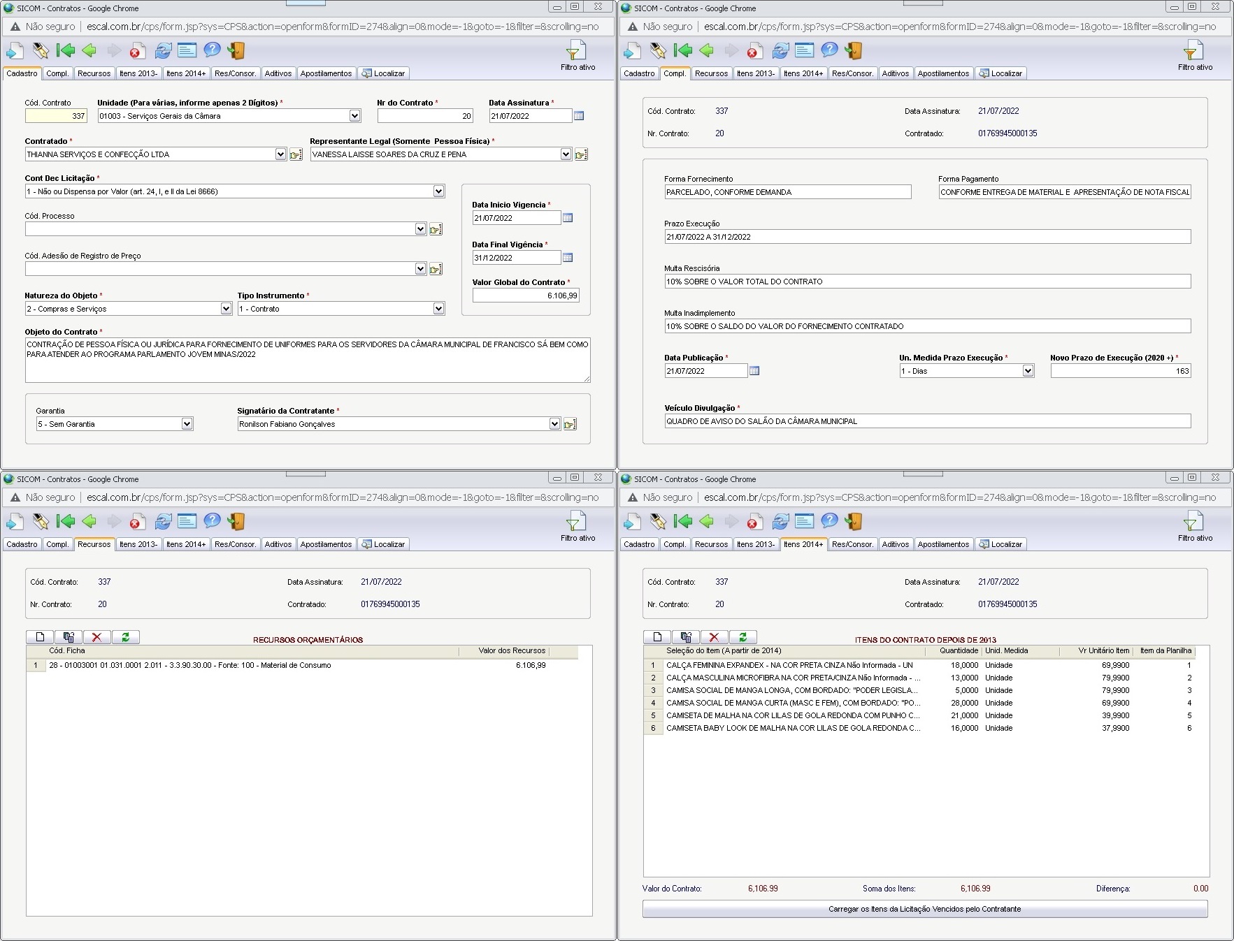 Extrato de Publicação do Contrato N.º 020/2022 - Processo Licitatório N.º 019/2022 - Dispensa N.º 018/2022 - Contratado: Thianna Serviços e Confecções Ltda. – CNPJ: 01.769.945/0001-35. 21/07/2022