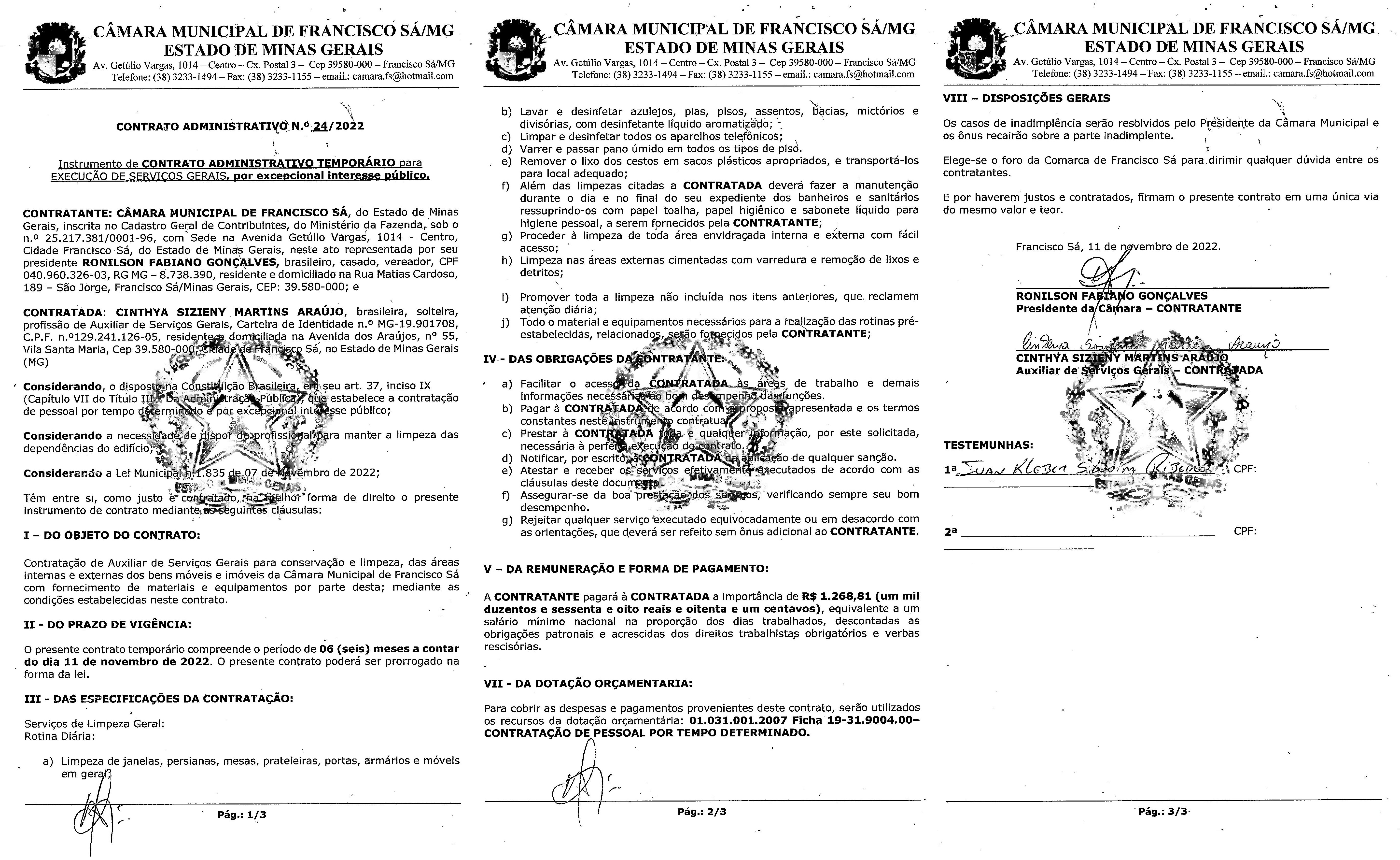 Extrato de Publicação do Contrato N.º 024/2022 - Contratação: Direta - Cargo: Auxiliar de Serviços Gerais - Contratada: Cinthya Sizieny Martins Araújo.