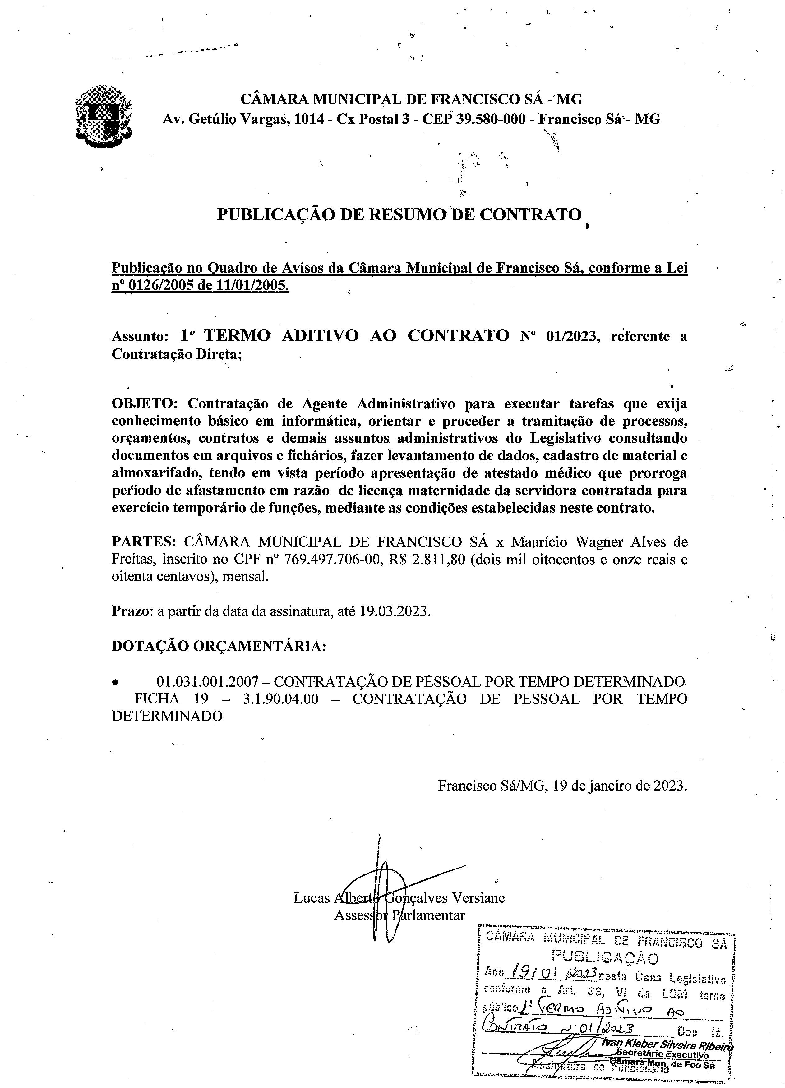 Extrato de Publicação do 1º Termo Aditivo ao Contrato N.º 001/2023 - Contratação: Direta - Cargo: Agente Administrativo - Contratado: Maurício Wagner Alves de Freitas