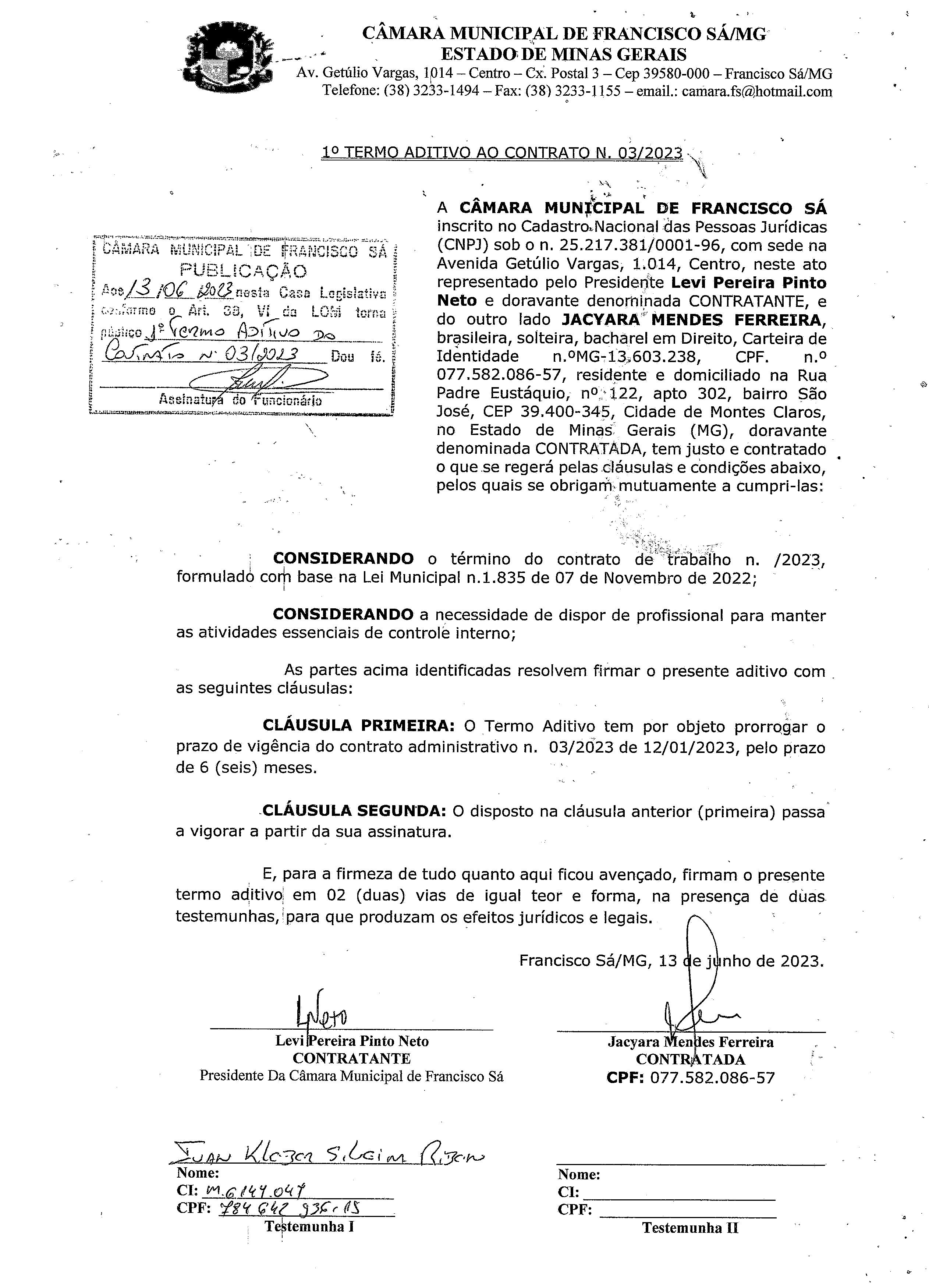 Extrato de Publicação do 1º Termo Aditivo ao Contrato N.º 003/2023 - Contratação: Direta - Cargo: Controlador Interno - Contratada: Jacyara Mendes Ferreira.