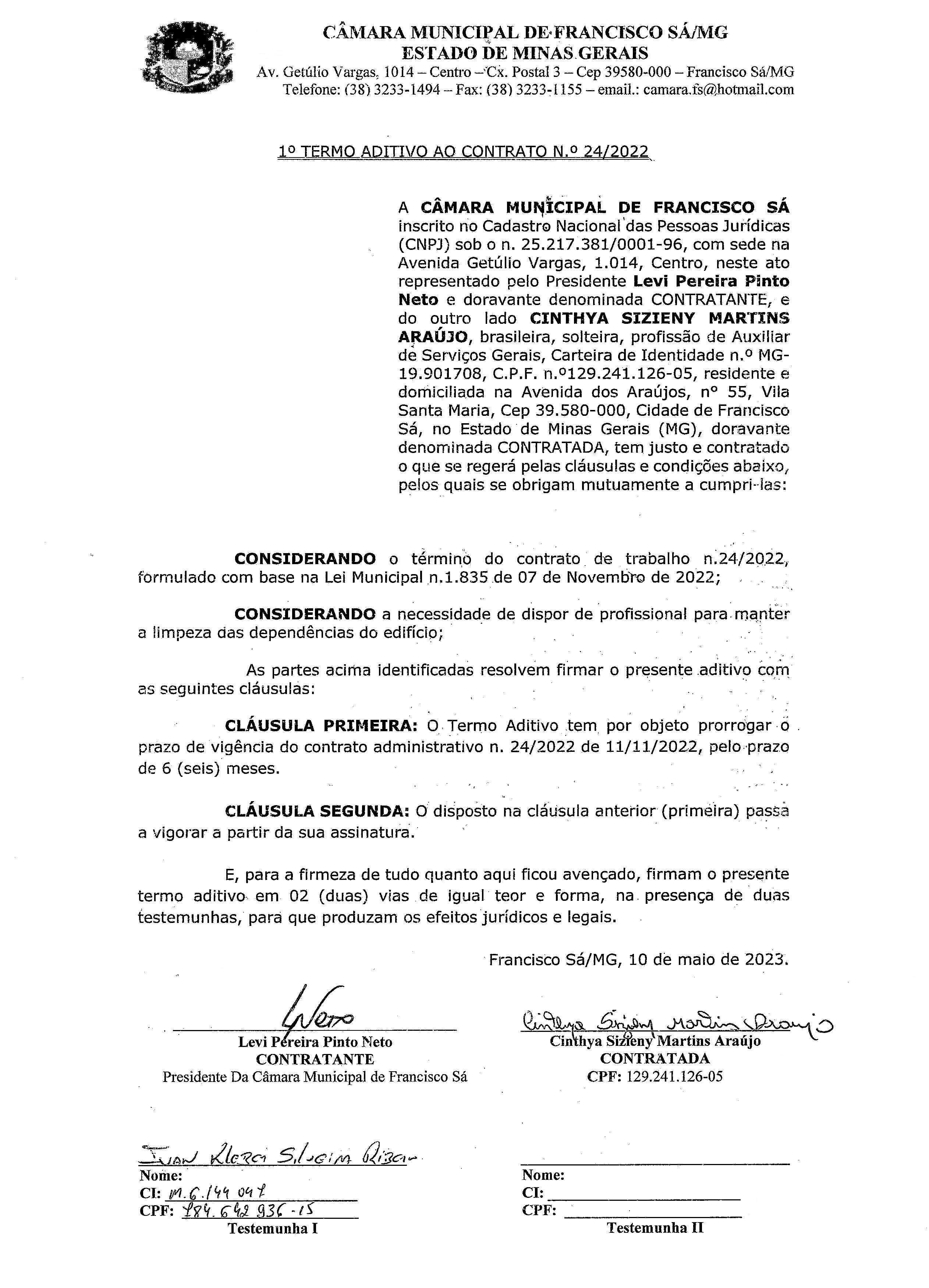 Extrato de Publicação do 1º Termo Aditivo ao Contrato N.º 024/2022 - Contratação: Direta - Cargo: Auxiliar de Serviços Gerais - Contratada: Cinthya Sizieny Martins Araújo.