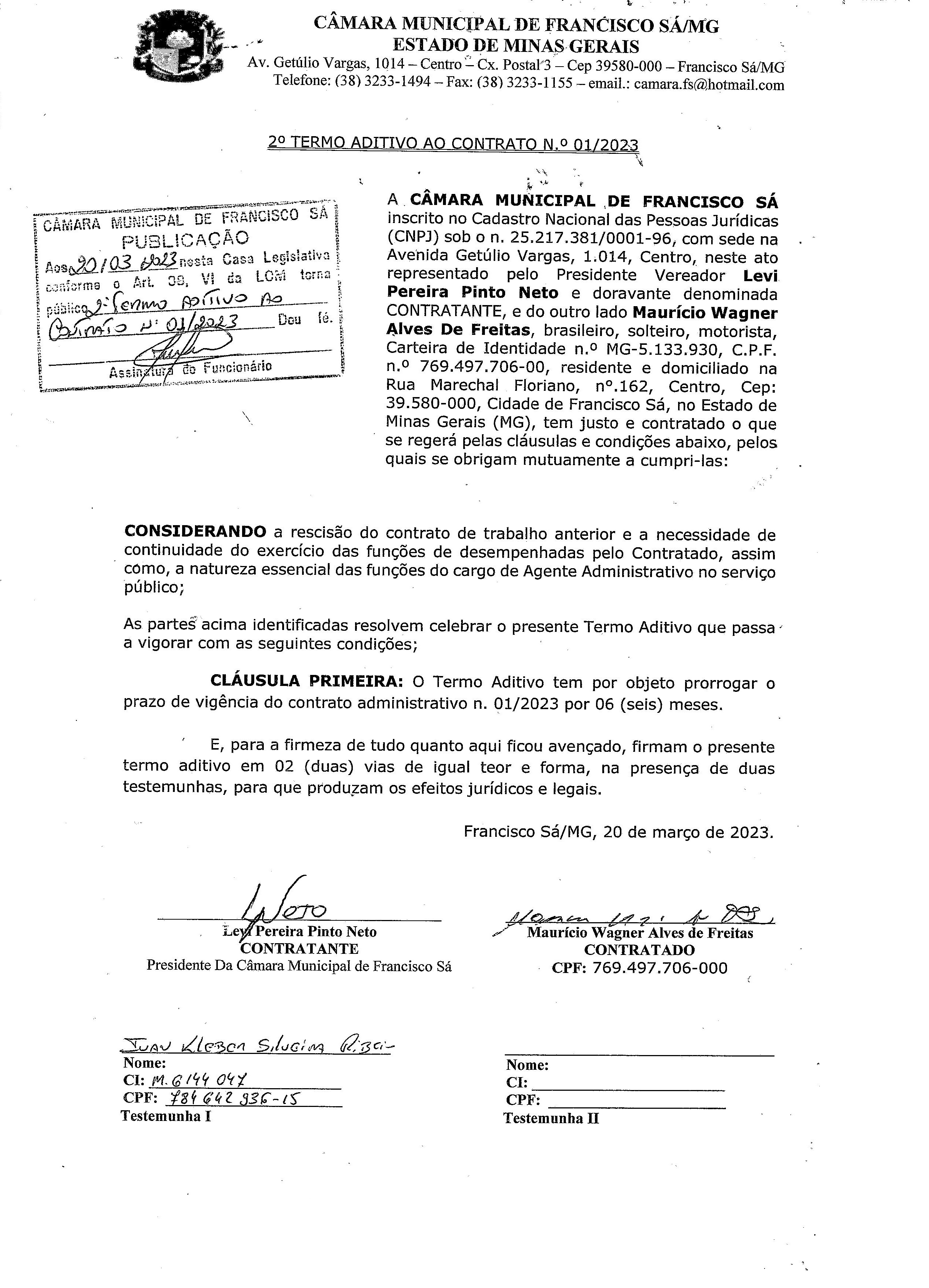 Extrato de Publicação do 2º Termo Aditivo ao Contrato N.º 001/2023 - Contratação: Direta - Cargo: Agente Administrativo - Contratado: Maurício Wagner Alves de Freitas