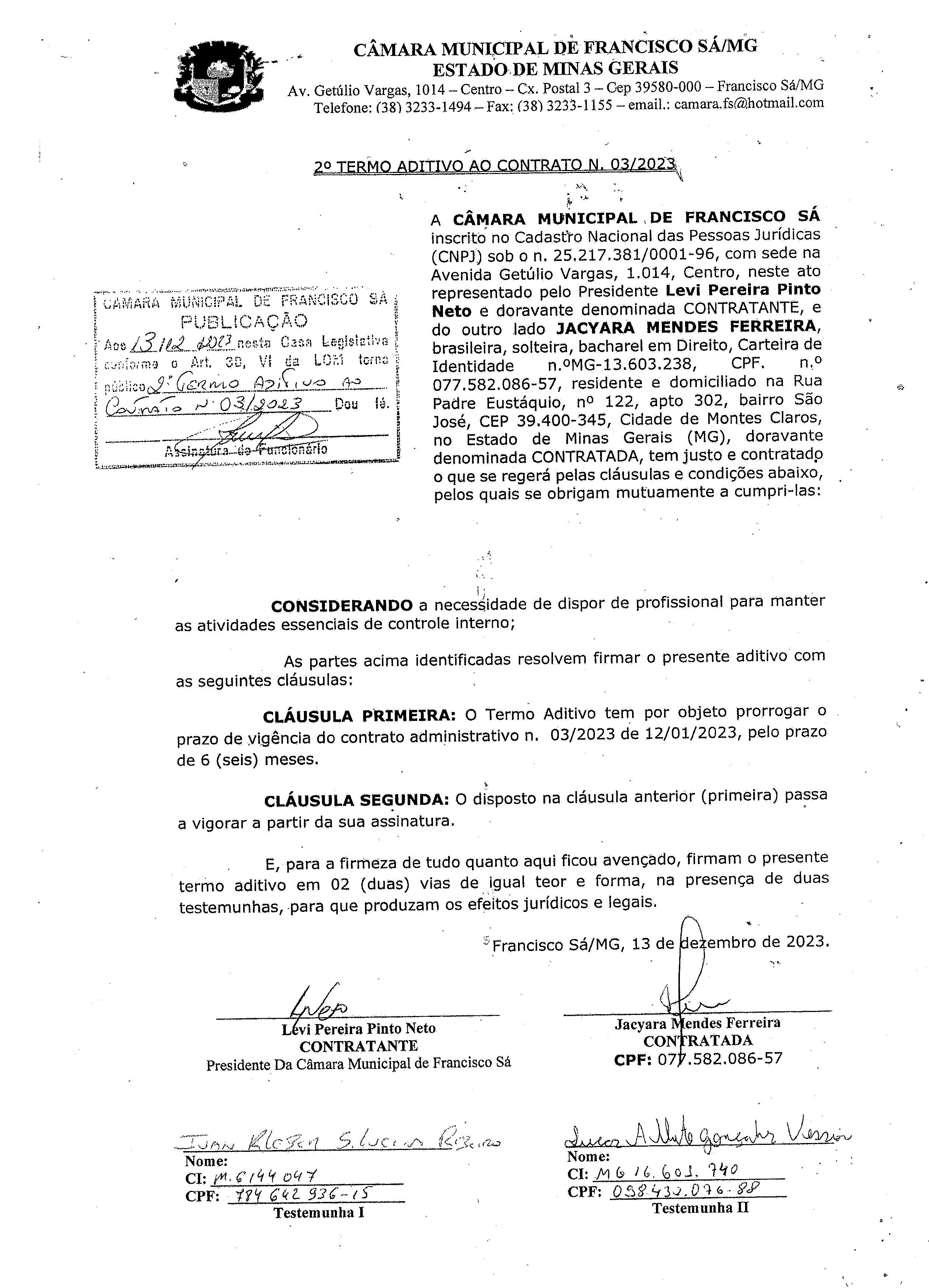 Extrato de Publicação do 2º Termo Aditivo ao Contrato N.º 003/2023 - Contratação: Direta - Cargo: Controlador Interno - Contratada: Jacyara Mendes Ferreira.