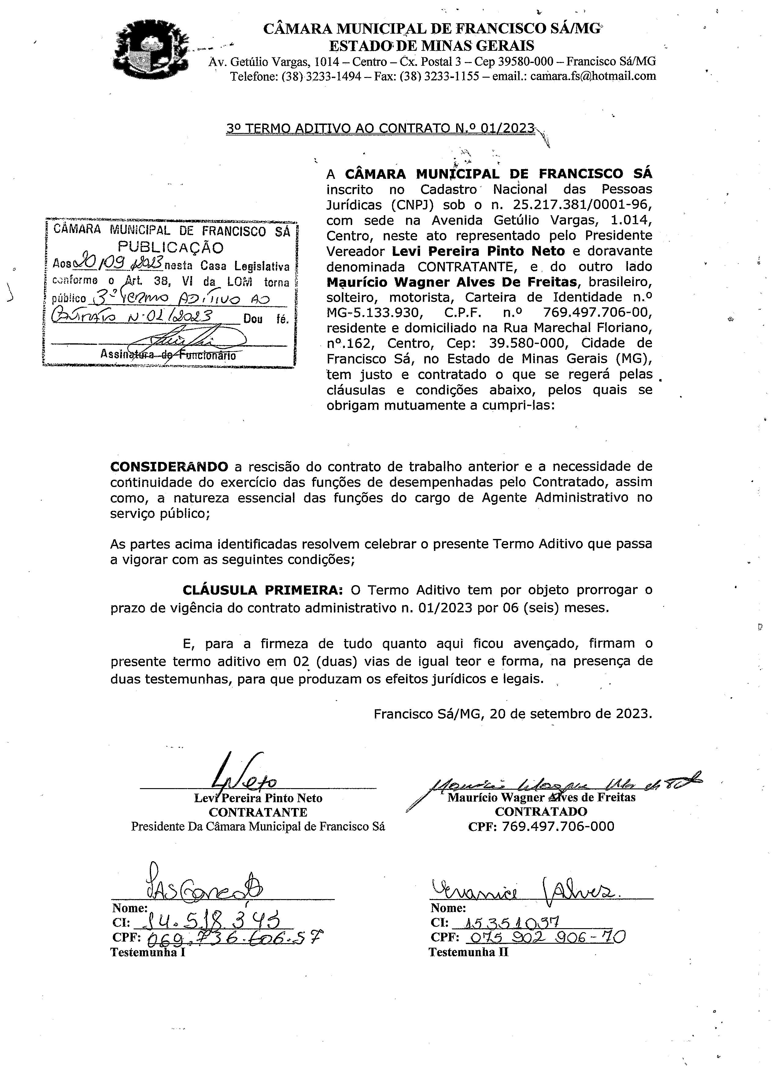 Extrato de Publicação do 3º Termo Aditivo ao Contrato N.º 001/2023 - Contratação: Direta - Cargo: Agente Administrativo - Contratado: Maurício Wagner Alves de Freitas
